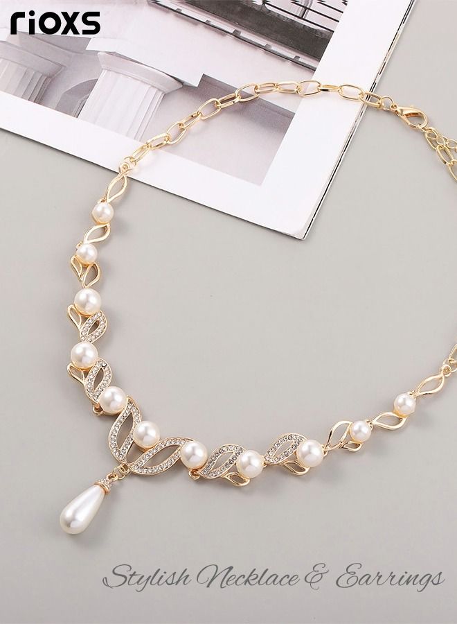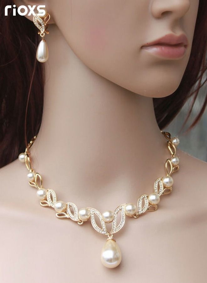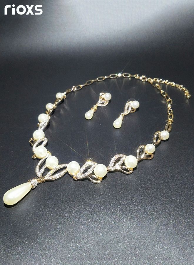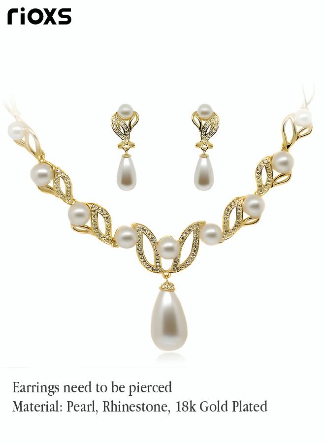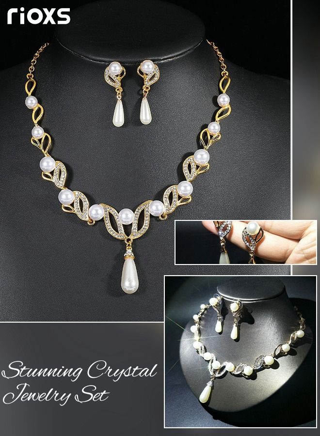 Women Pearl Jewelry Set Gold Plated Rhinestone Necklace Earring Set Gift for Girls on Birthday