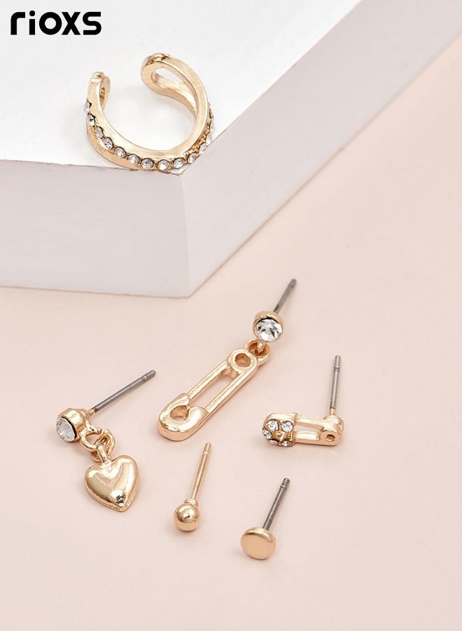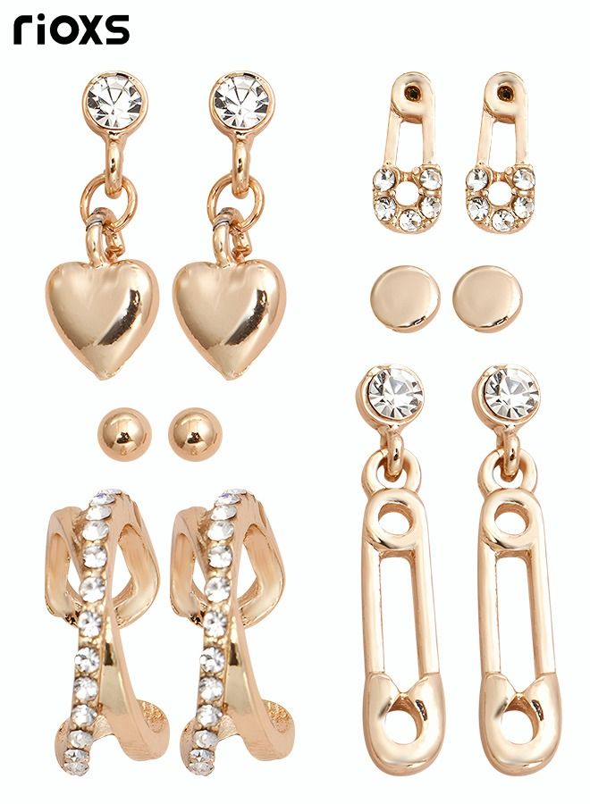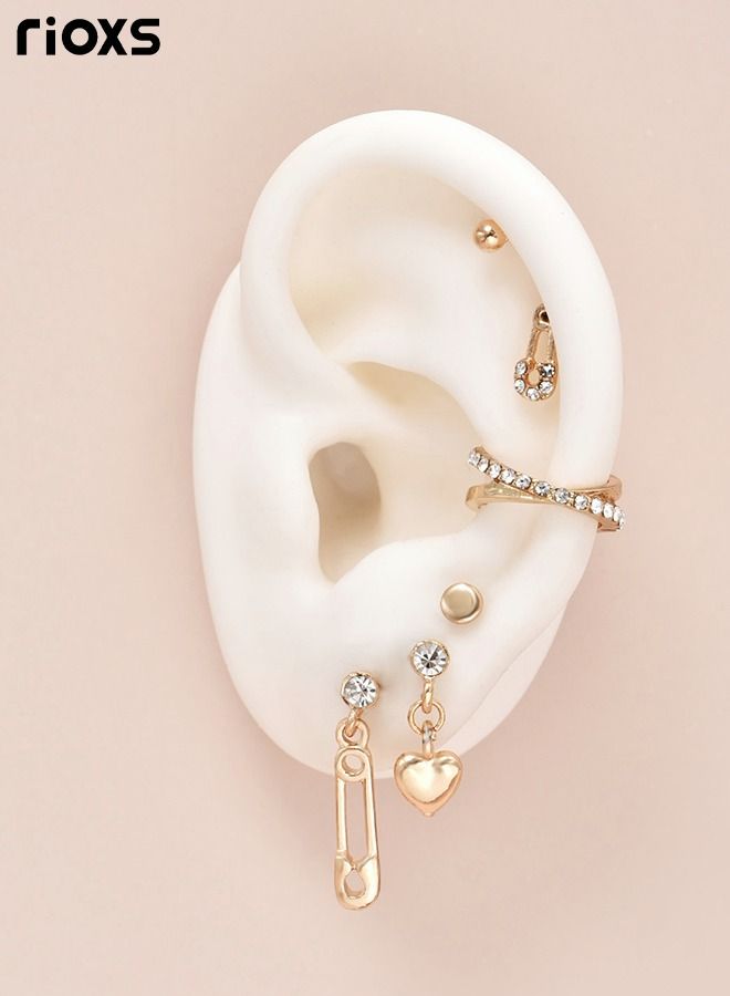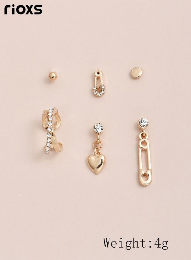 6 Pairs Women Metal Earrings Gold Rhinestone Pin Heart Desigh Earrings Gift for Girls on Birthday Valentines Day