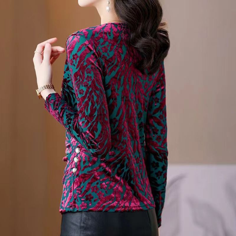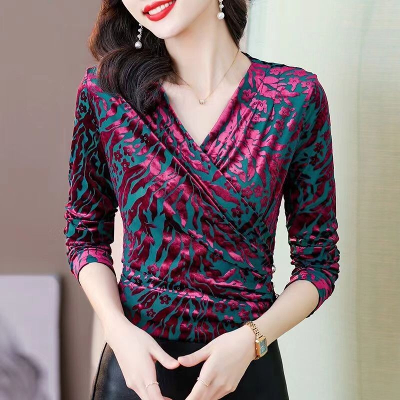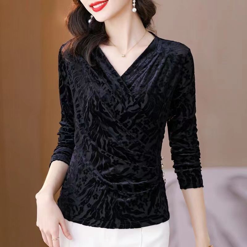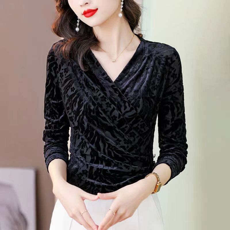 | nameOriginal | Gold velvet T-shirt women's long-sleeved bottoming shirt spring, autumn and winter New mom fashion Western style cross V-neck inner top |