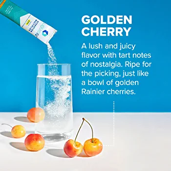 Our drink mix has a lush and juicy flavor with tart notes of nostalgia, just like a bowl of golden Rainier cherries. It contains 5 essential vitamins, including Vitamins B3, B5, B6, B12, and Vitamin C. It is also gluten-free, soy-free, and dairy-free, making it suitable for people with dietary restrictions.