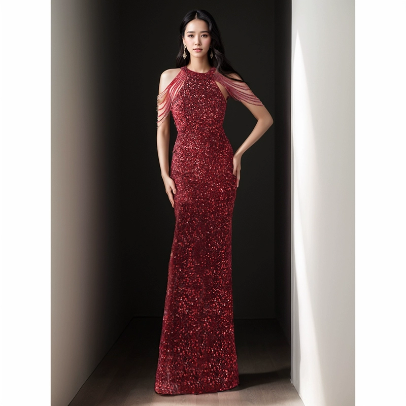 | nameOriginal | Golden evening dress for women 2024 new high-end light luxury niche high-end banquet temperament host shiny fishtail skirt |