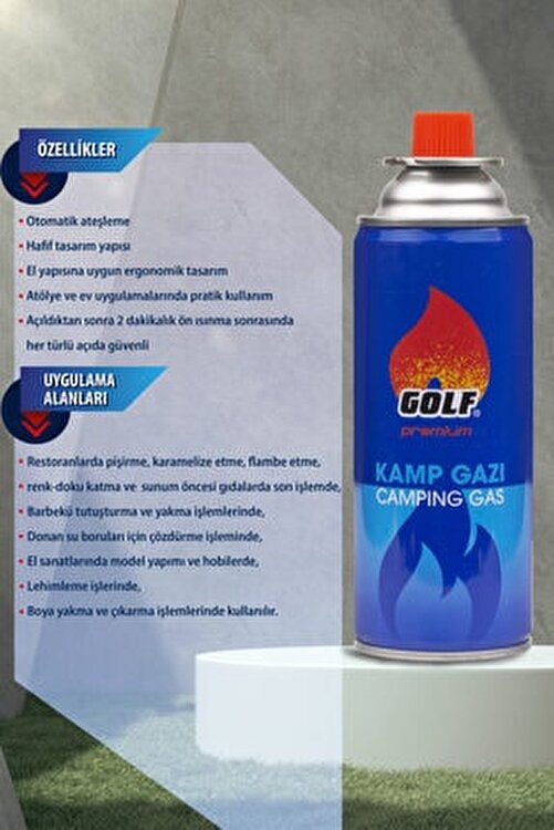 Golf Cosmetics Golf Premium Camping Cooker Gas Cartridge with Valve 227g GOLF CAMPING GAS: Quick ignition gas. Protect from direct sunlight. Do not expose to temperatures above 50 C. Flammable gas under pressure. Keep out of reach of children. This cartridge conforms to TS EN-417. APPLICATION AREAS It is used in cooking, caramelizing, flambing, color texture adding and finishing in food before presentation, BBQ ignition and burning operations, thawing for frozen water pipes, model making and hobbies in crafts, Soldering works, Paint burning and removing processes. STORAGE INSTRUCTION: Store in cool and dry places with good ventilation. Prevent contact with heat/sparkling/open fire/hot surfaces. Do not smoke. DISPOSABLE CARTRIDGE. WARNING: CAN NOT FILL AGAIN