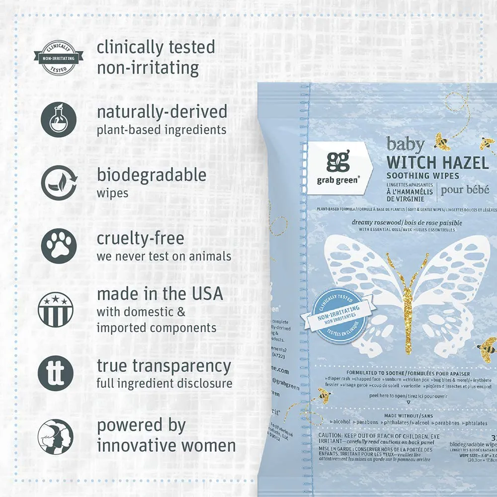 Grab Green Natural Baby Witch Hazel Soothing Wipes, Soothe Common Skin Irritations Such as Diaper Rash, No Alcohol, Plant-Based & Biodegradable, Dreamy Rosewood-with Essential Oils, 32 Wipes (3 Pack)