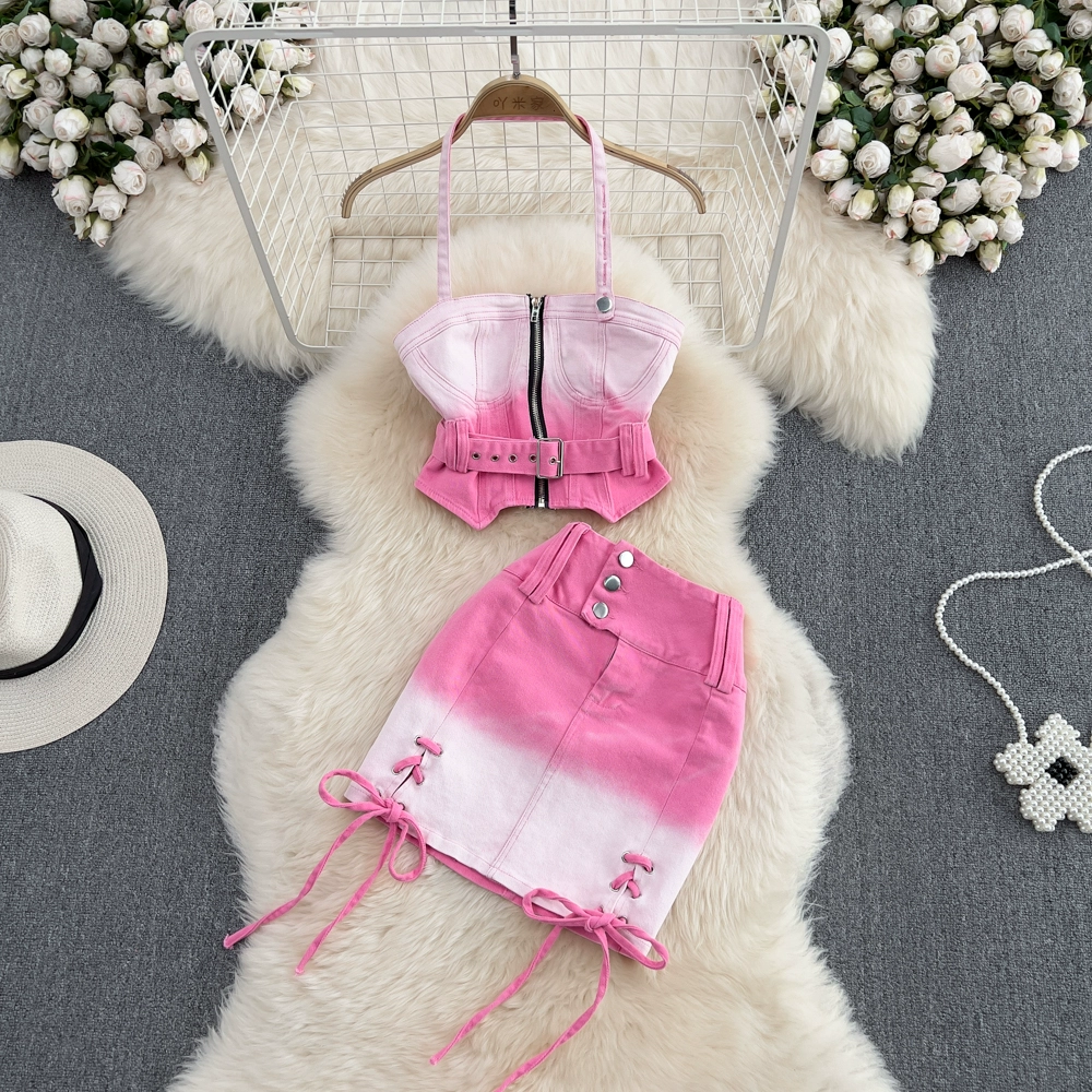 | nameOriginal | Gradient color denim fashion suit for hot girls, sexy halterneck camisole two-piece set, high-waisted A-line skirt |