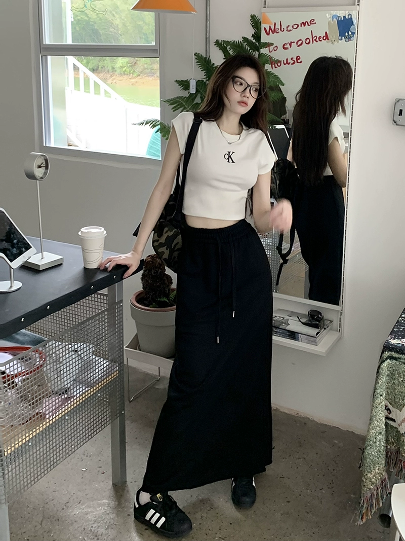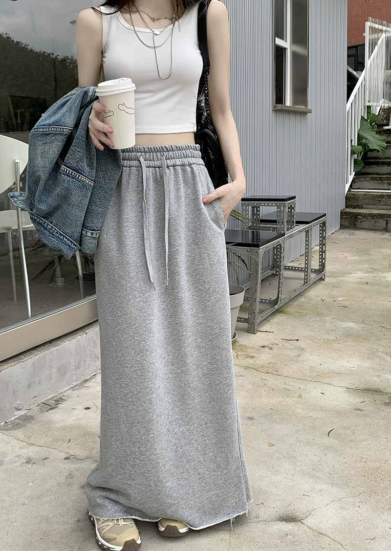 Gray elastic waist drawstring casual mid-length skirt
