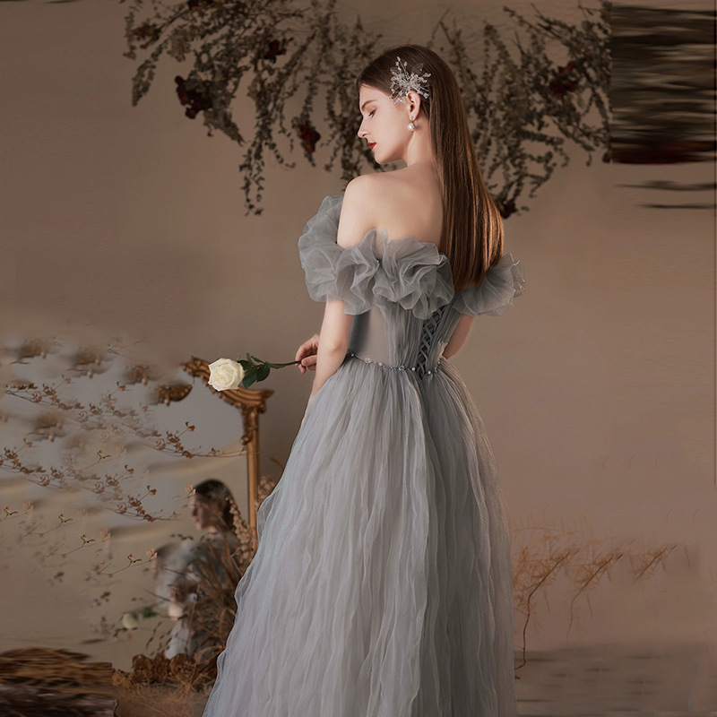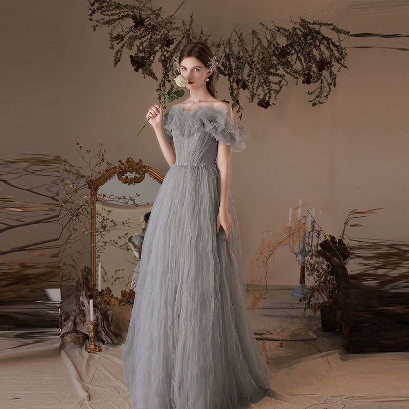 Gray evening dress 2024 new off-shoulder fairy temperament engagement design sense student art exam evening dress for women