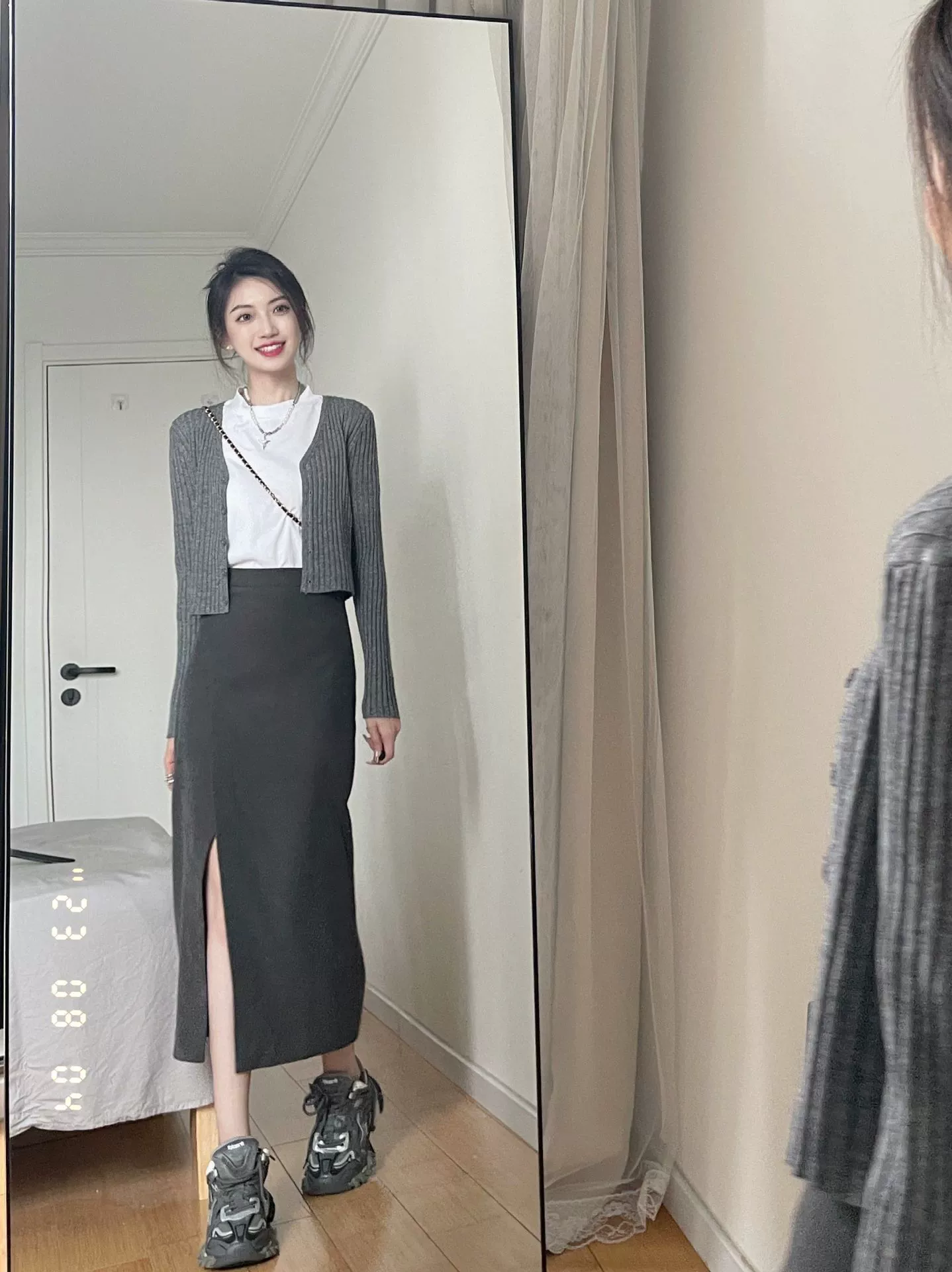| nameOriginal | Gray mid-length high-end design slit skirt |