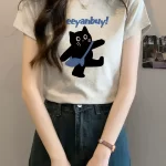 | nameOriginal | Gray right shoulder slim short-sleeved T-shirt for women summer ins cute cat print Korean versatile slim short top |