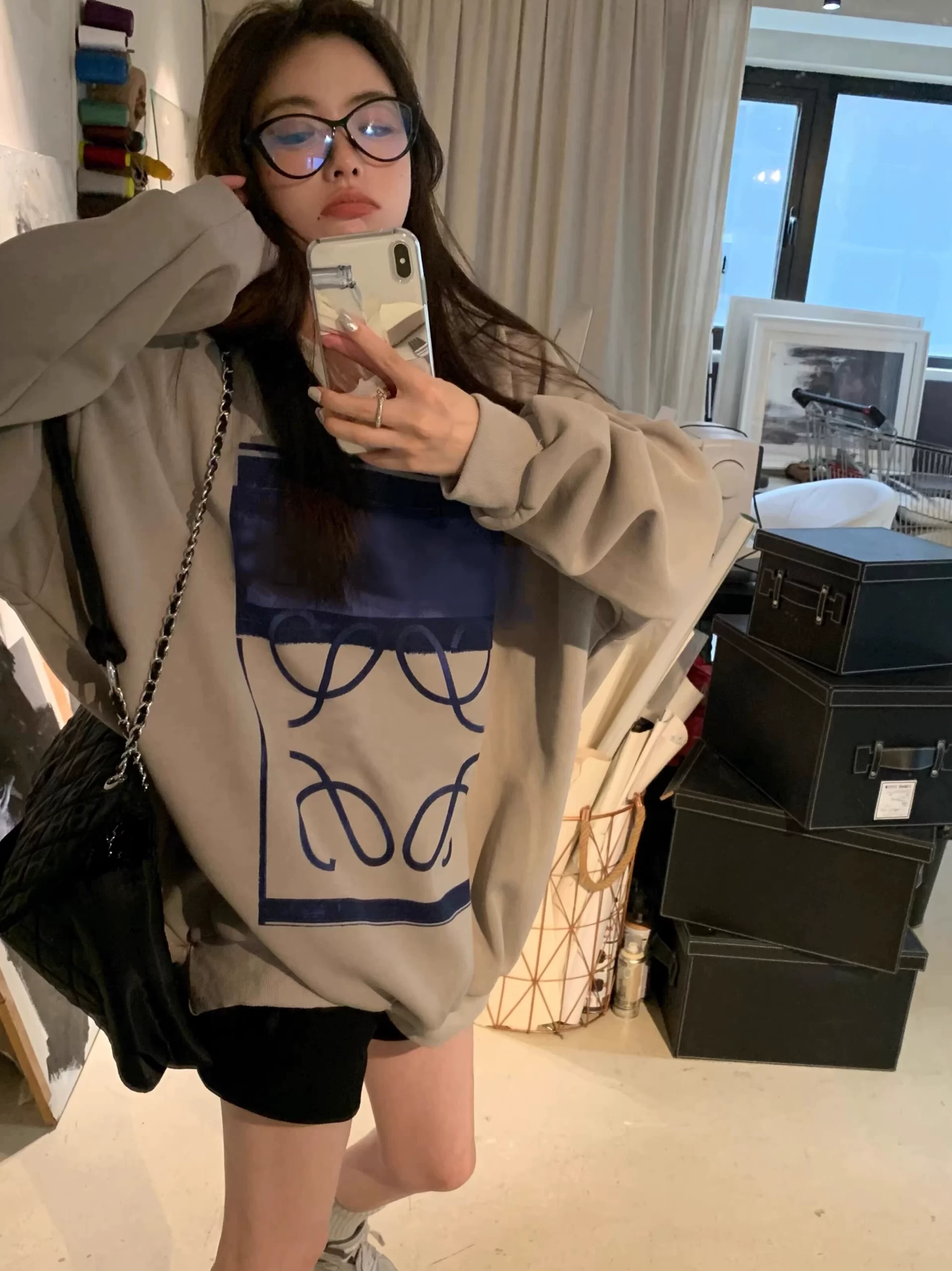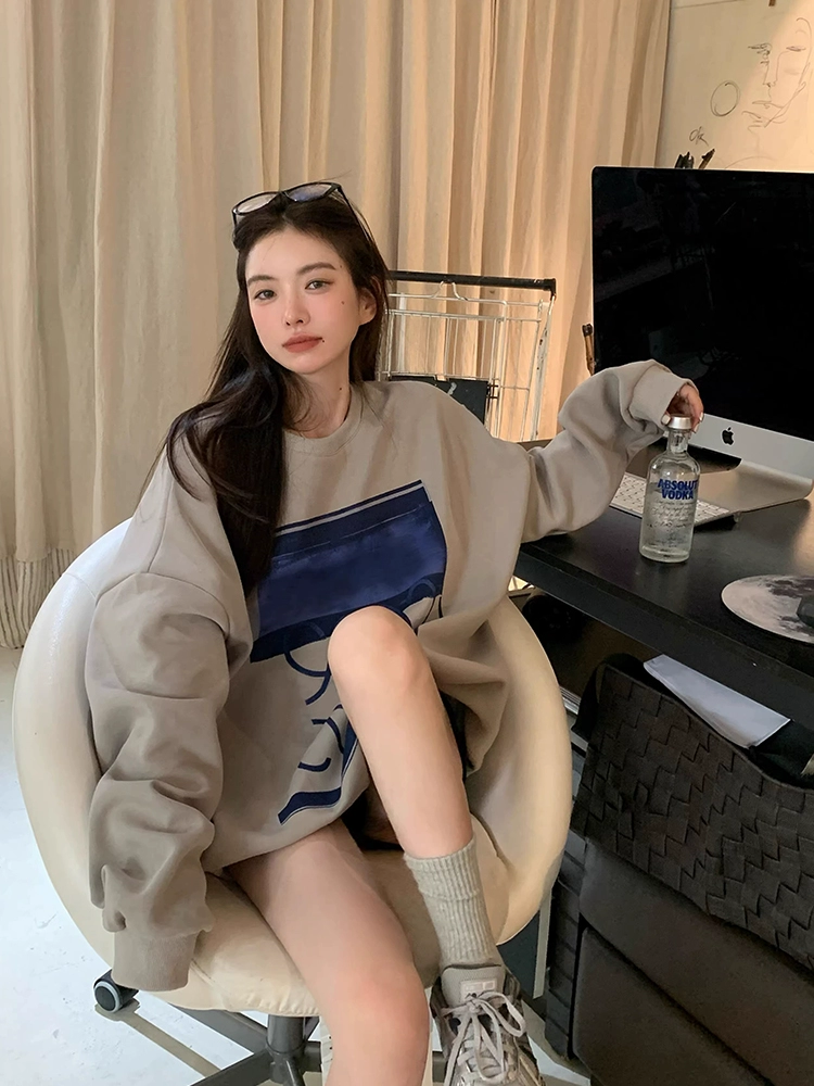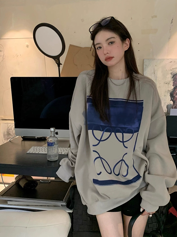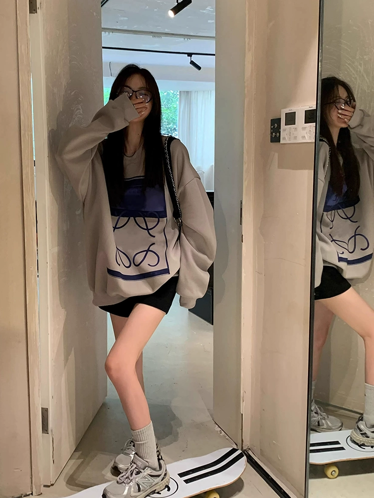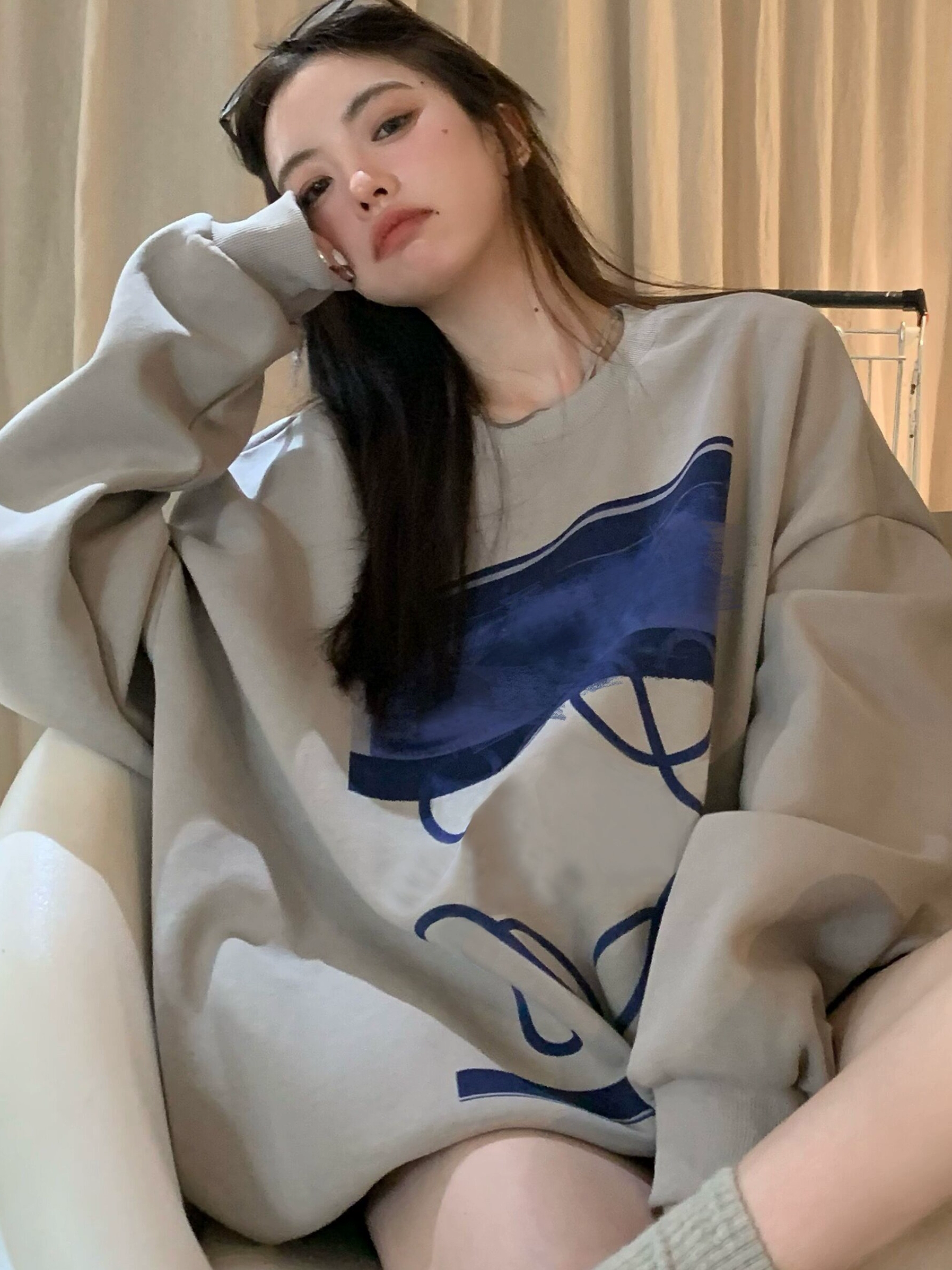 | nameOriginal | Gray round neck pullover sweatshirt for women spring and autumn 2024 new style mid-length loose bf lazy style jacket top trend |