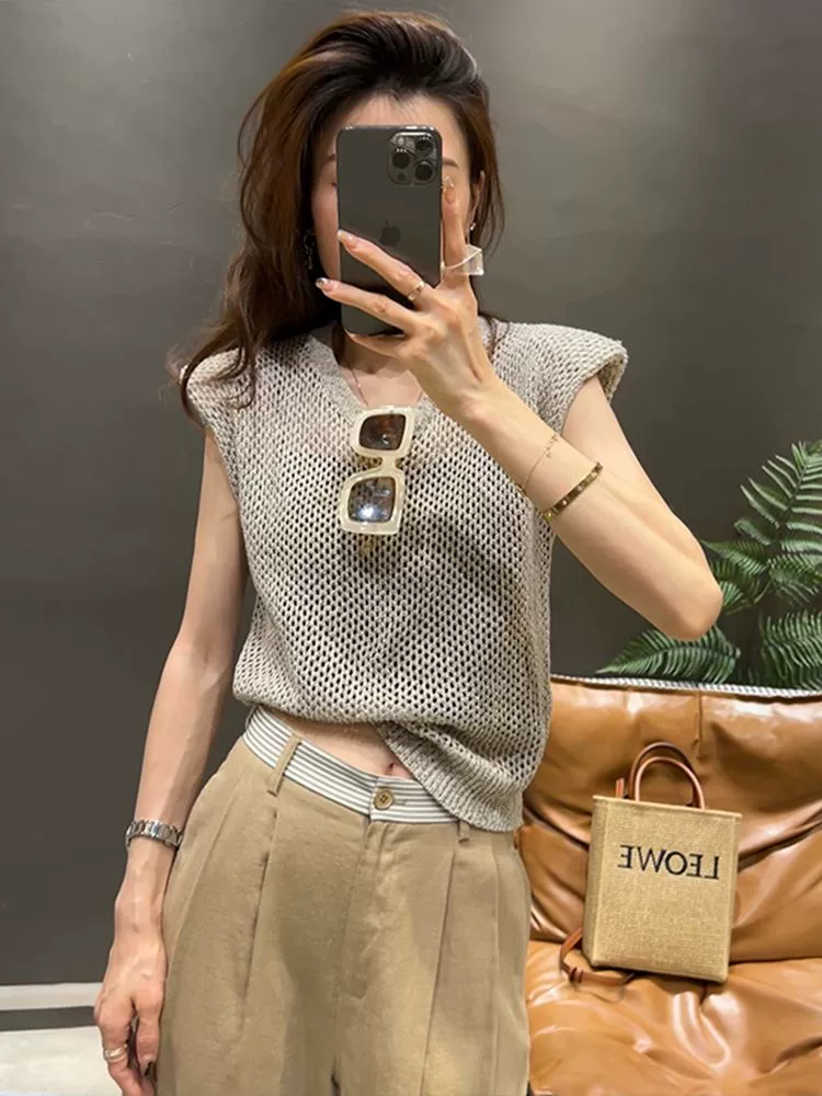 | nameOriginal | Gray Sleeveless Round Neck Ice Silk Hollow Knitted Sweater Women Summer 2024 New Casual Western Style Versatile Vest Top |