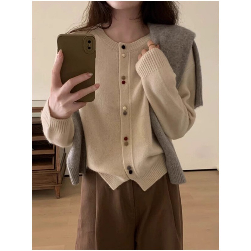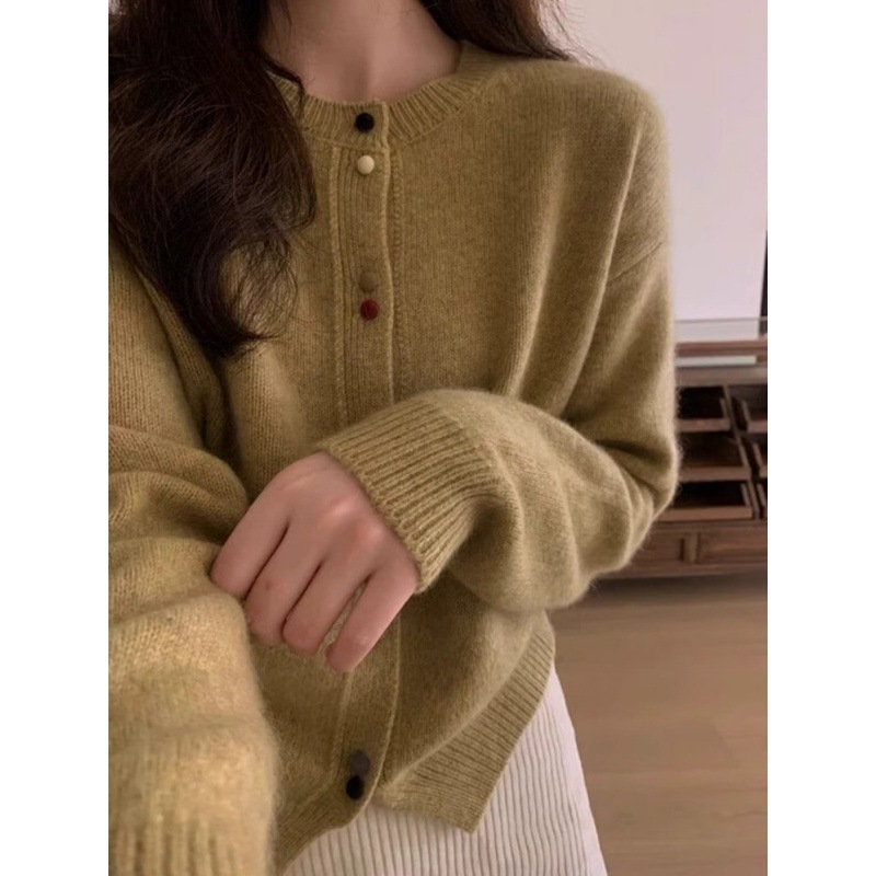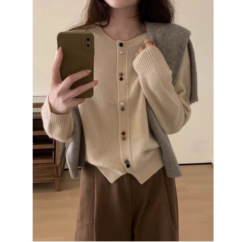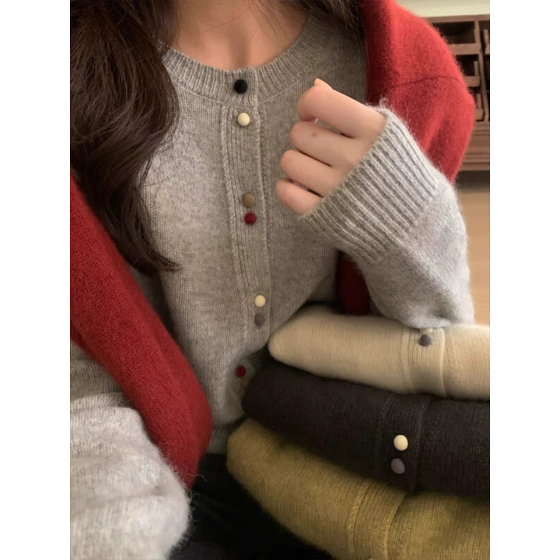 | nameOriginal | Gray soft glutinous round neck knitted cardigan women's spring outer wear thin lazy style loose long sleeve short sweater coat |