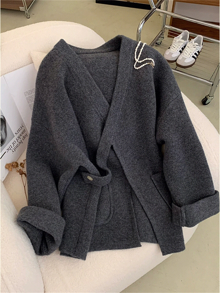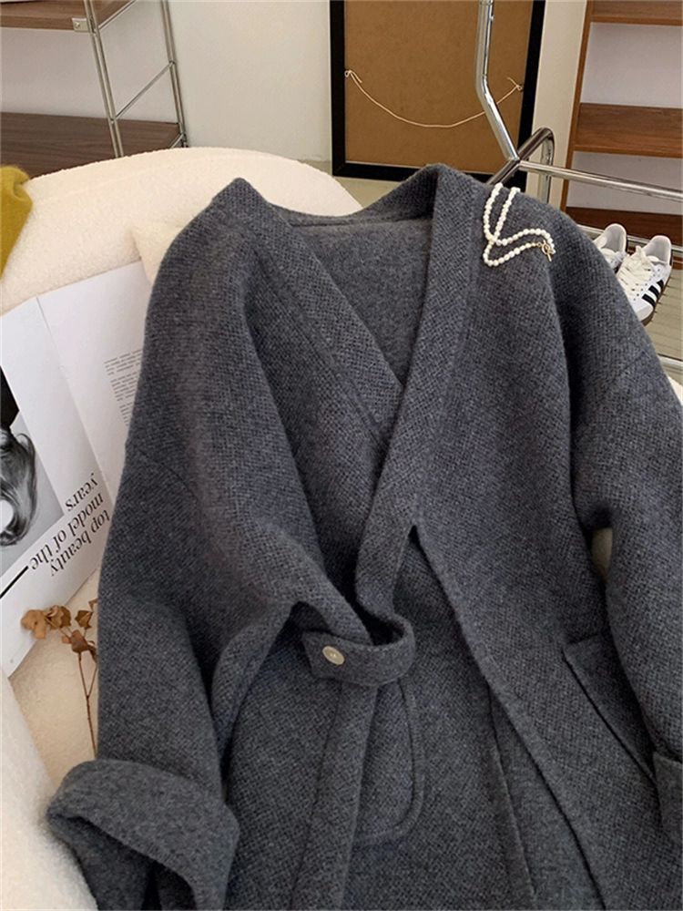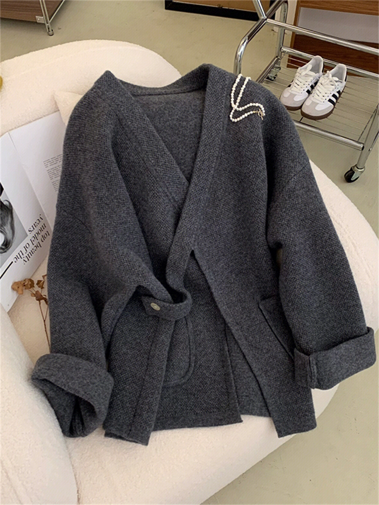 | nameOriginal | Gray v-neck sweater top for women in autumn and winter loose lazy style mid-length raccoon velvet sweater cardigan jacket |