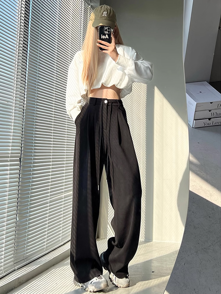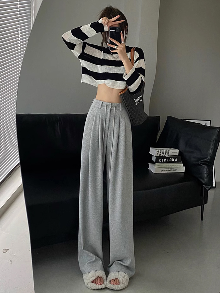 Gray wide-leg sports pants for women Spring and Autumn wear high waist draping loose suit trousers drawstring casual trousers