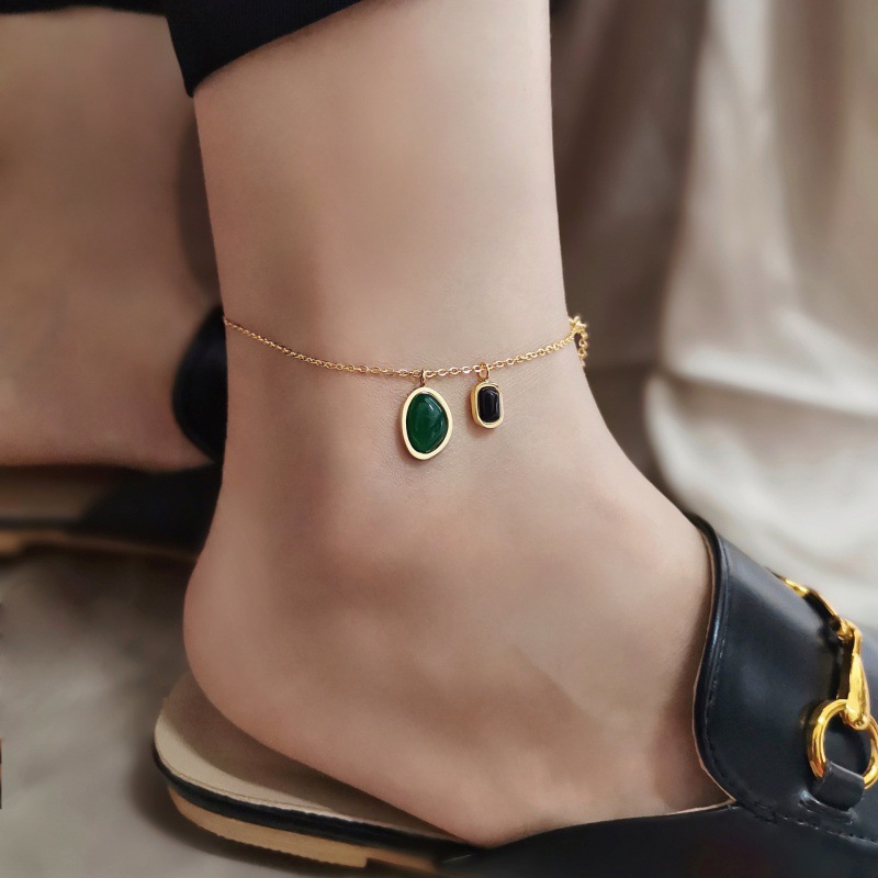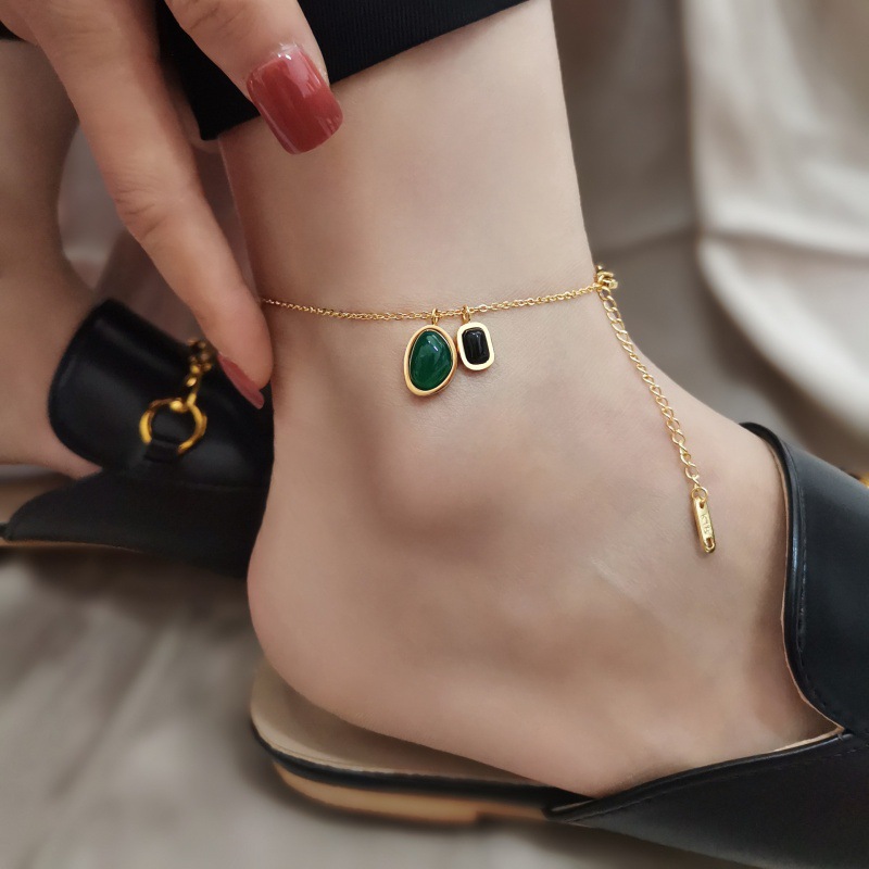Green and Black Onyx Stone Anklet Women's High-end Ins Design Niche 18K Gold-plated Titanium Steel Light Luxury Emerald Foot Chain for Women