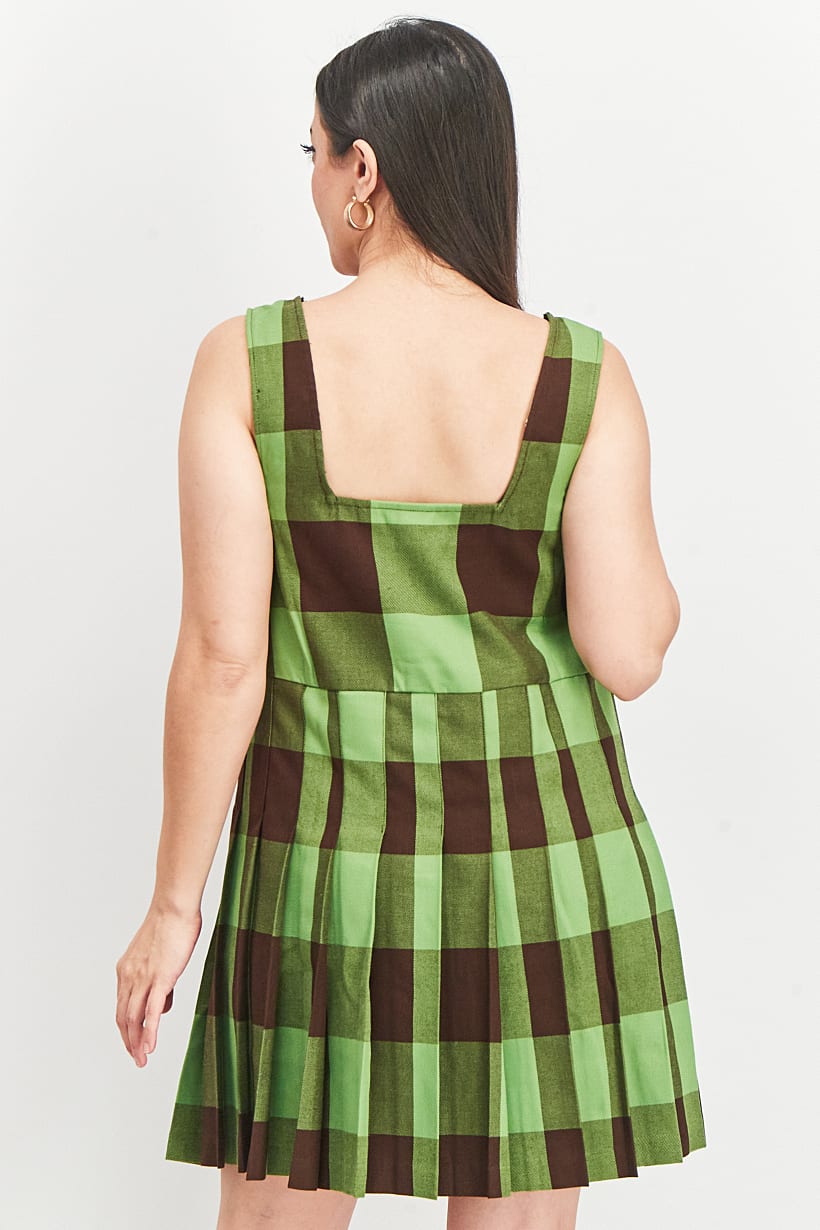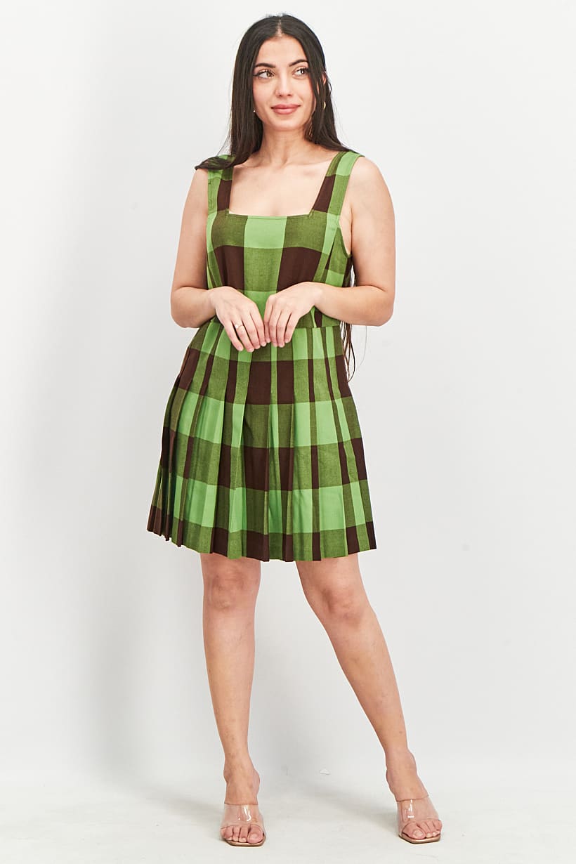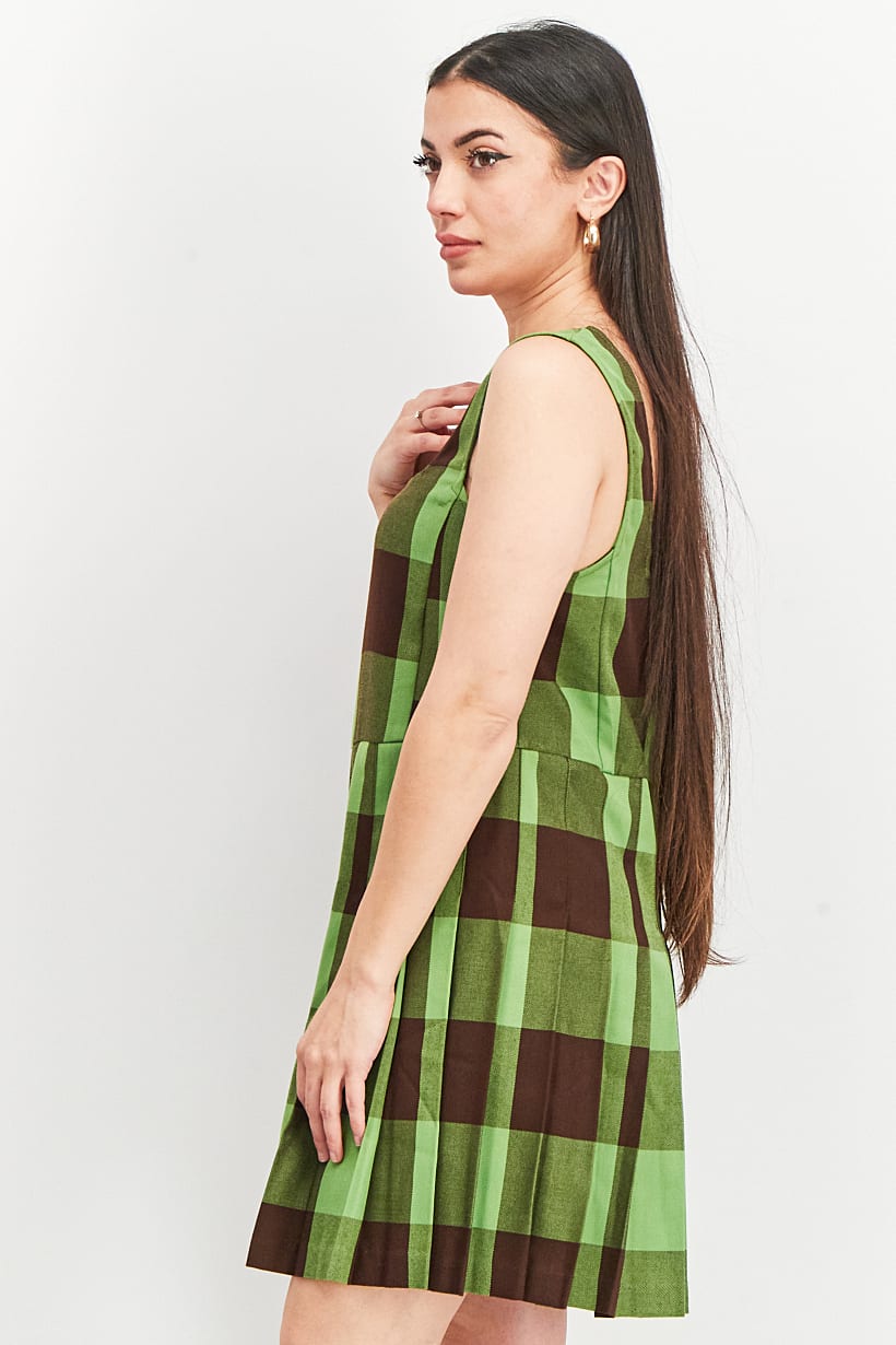 | nameOriginal | Women Pleated Sleeveless Checkered Mini Dress, Green/Brown |