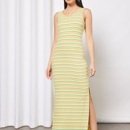 | nameOriginal | Casual Scoop Neck Sleeveless Stripes Bodycon High Slit Long Evening Maxi Dress Green Yellow STP |