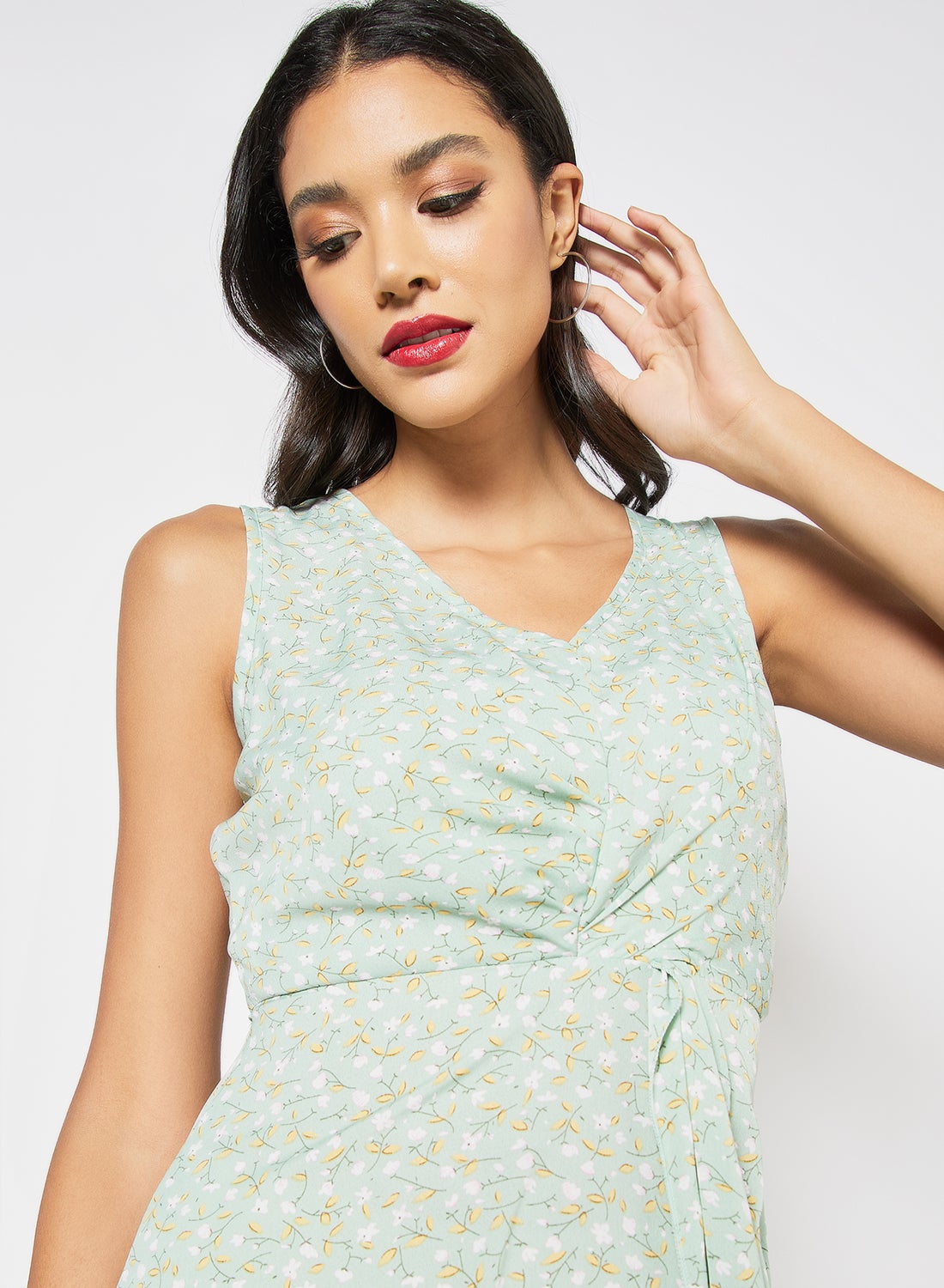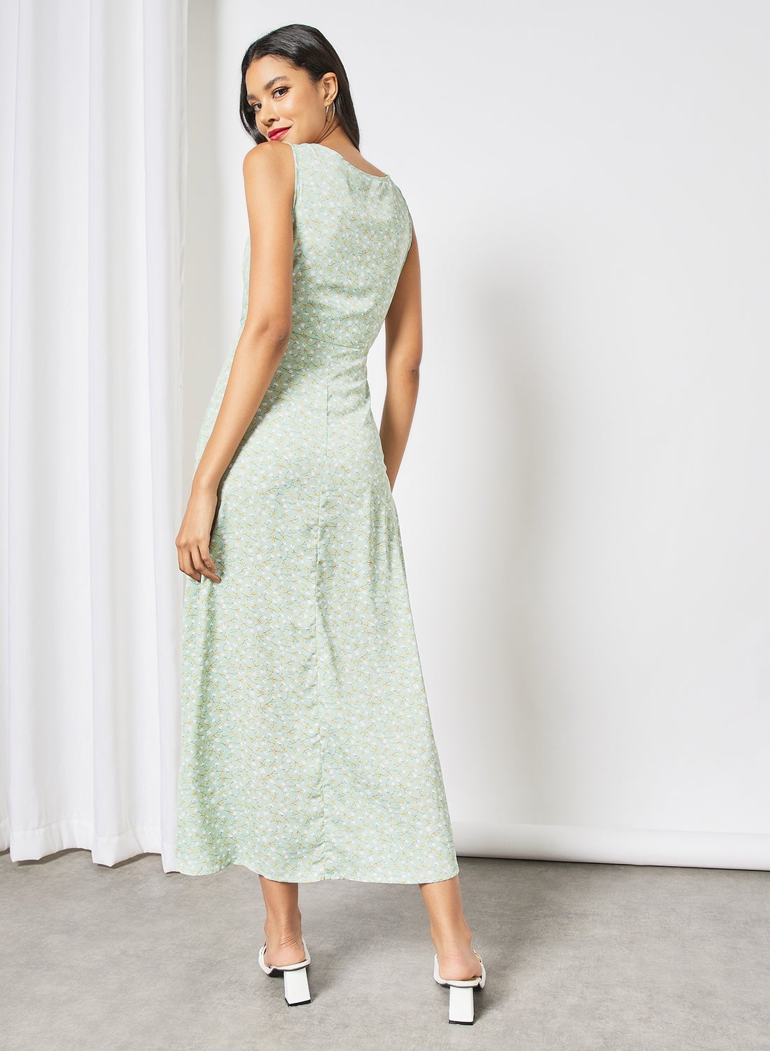Floral Printed Tie-Waist Midi Dress Green/Beige/White