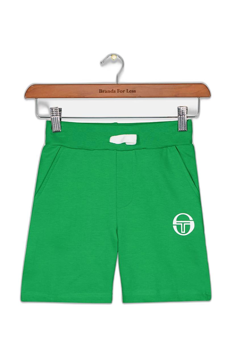 This product is suitable for boys and can be easily washed in a machine. It is a basic short with a drawstring closure and side pockets. Please note that the color of the product may appear slightly different due to lighting or monitor settings. The fabric is made of 95% cotton and 5% elastane, making it comfortable for casual wear. The brand logo is printed on the shorts, which come in a green color.