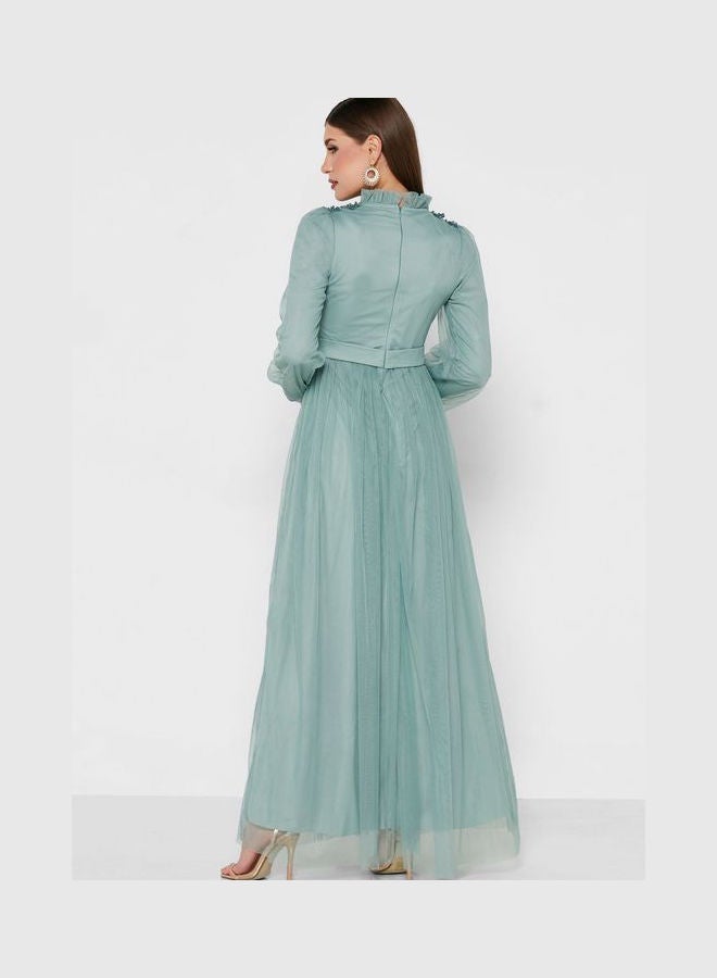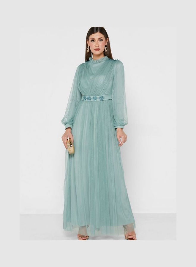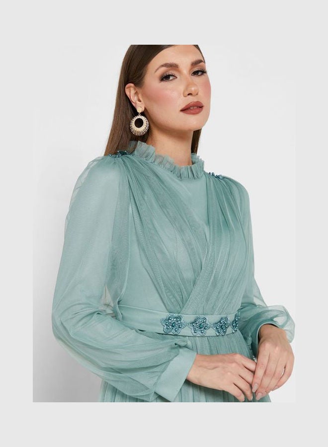 Choose this sophisticated garment for a memorable look that will make you stand out from the rest. Made from a lightweight and airy polyester tulle material, it features a ruffled high neckline and long sleeves. The shoulders and waist are adorned with intricate beaded lace details, while the skirt boasts pleated accents. Additionally, soft padded cups provide extra support for a comfortable fit.