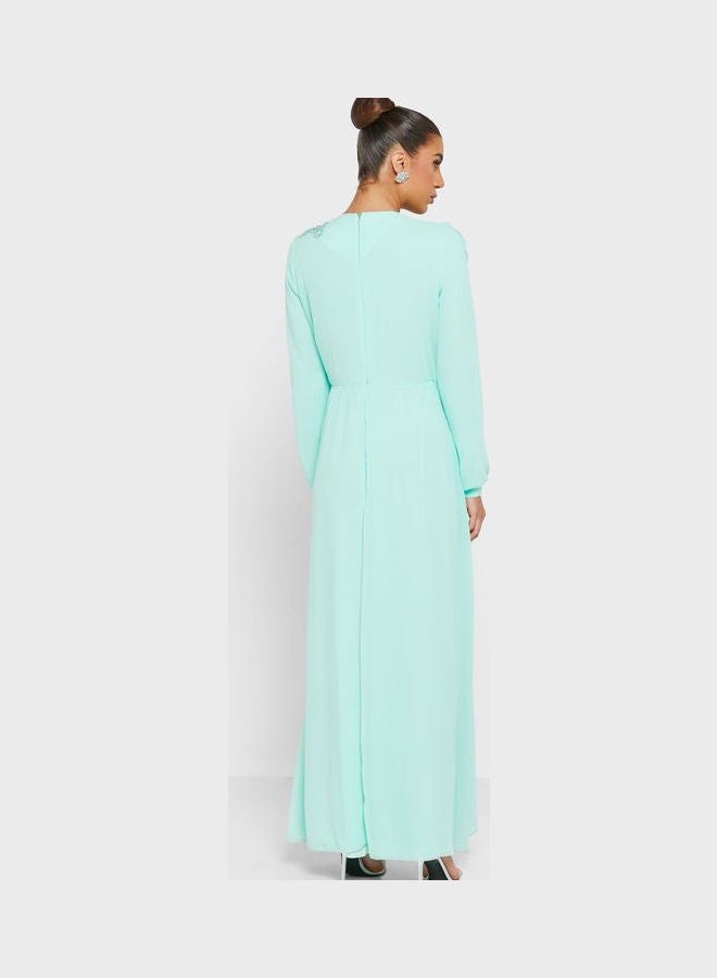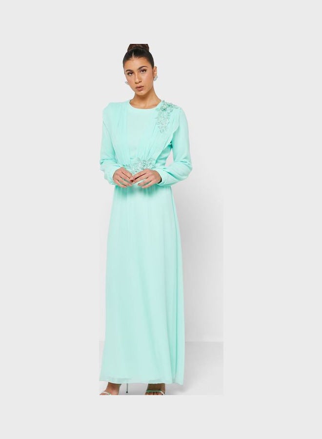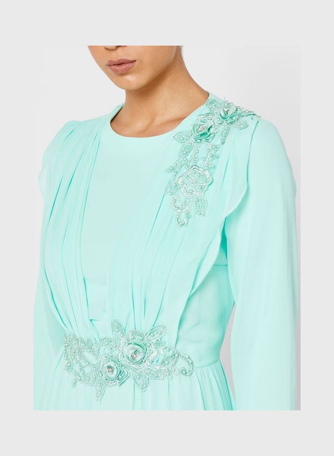 Revamp your occasion wear with a modern twist in this stunning dress featuring intricate lace detailing. The dress exudes elegance and sophistication, with a touch of fierceness. Made from soft and comfortable polyester fabric, it boasts a beautiful floral lace panel adorned with delicate beadwork on the front. The dress features a classic round neck and long sleeves, and is finished with a concealed zipper closure at the back.