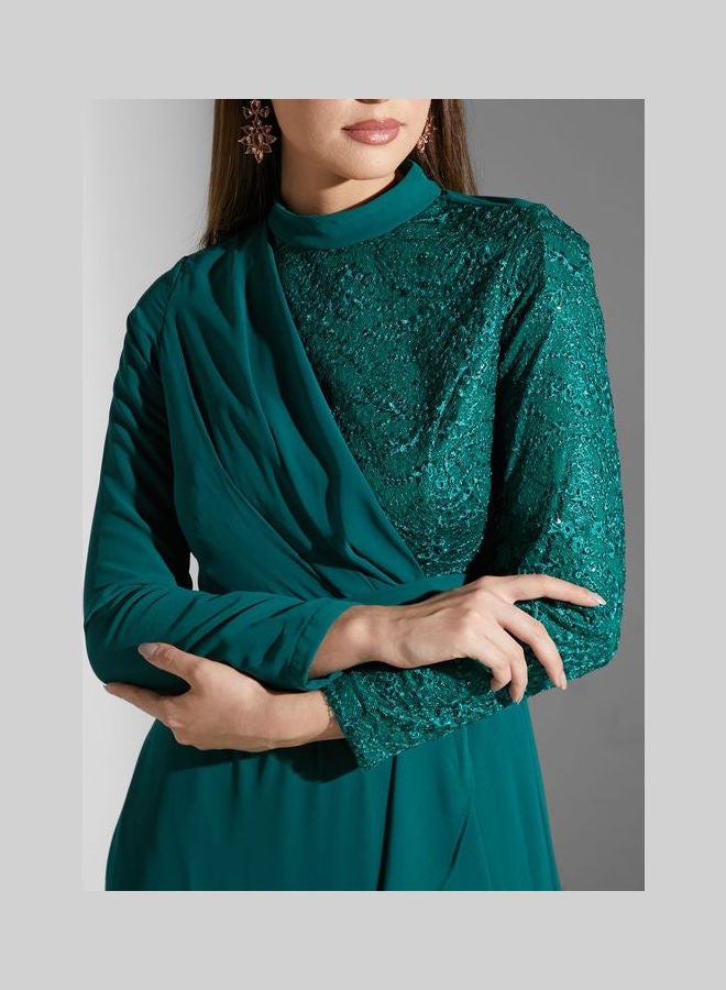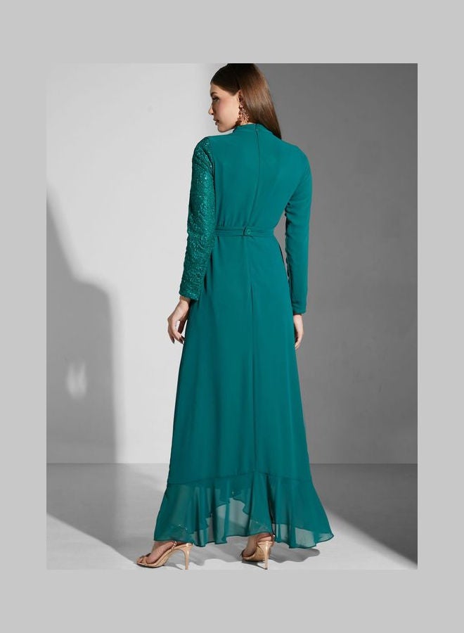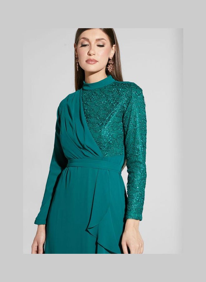 Choose this sophisticated garment when you want to make a statement and be noticed. Made from a light and airy polyester material, it features a high neckline and long sleeves. The bodice is adorned with a sequined lace panel, while the skirt boasts an asymmetrical ruffle trim. The reverse side is secured with a zipper closure.
