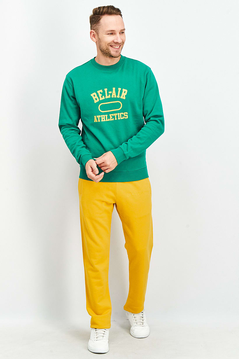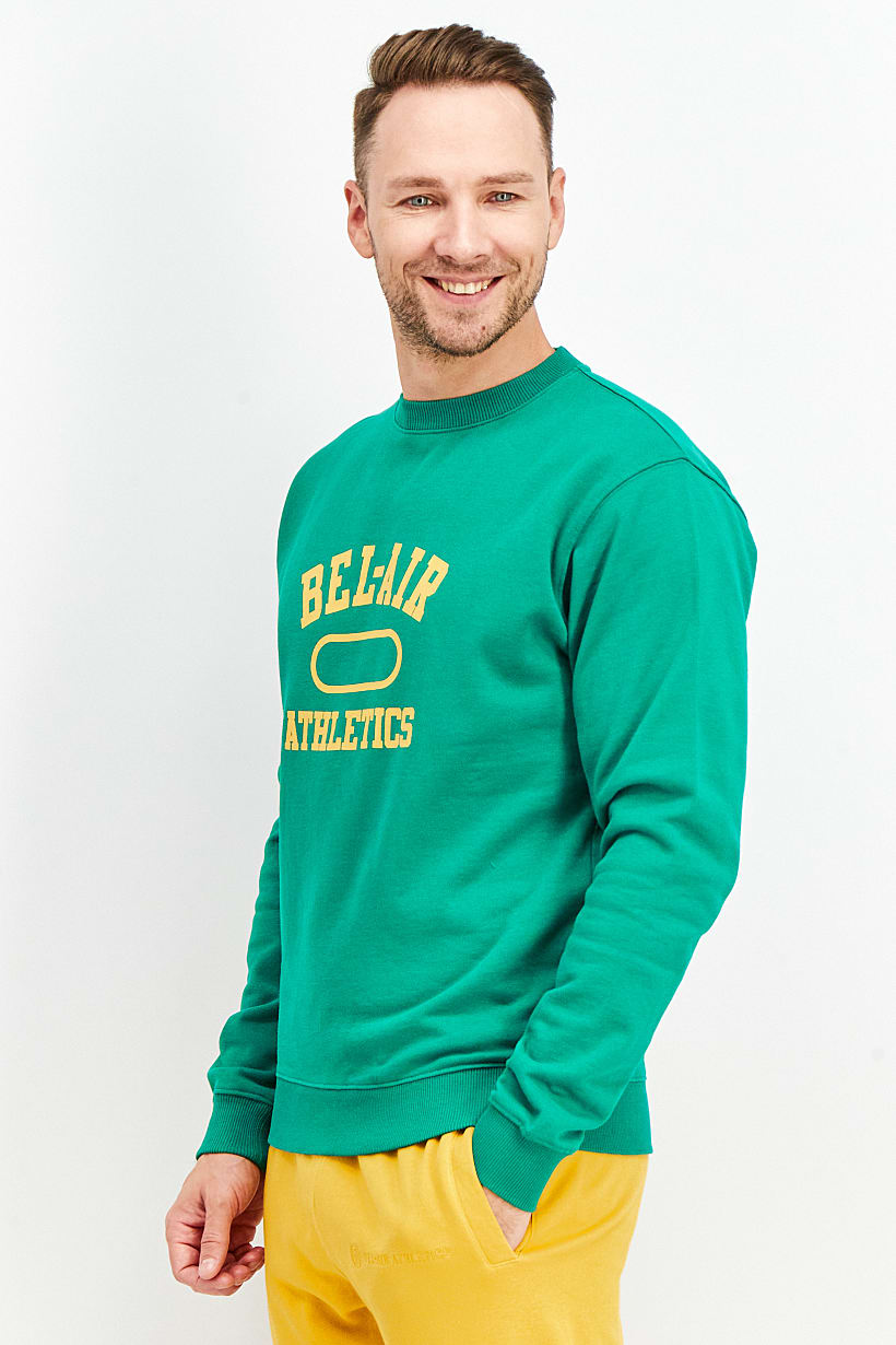 This product is easy to care for as it is machine washable. It has a sportswear fit and is available in international sizes. The thickness of the fabric is medium, making it suitable for outdoor sports. Please note that the product color may appear slightly different due to lighting or monitor settings. The sweatshirt is made of 100% cotton and features a brand logo pattern and print. It is a green-colored sportswear item.