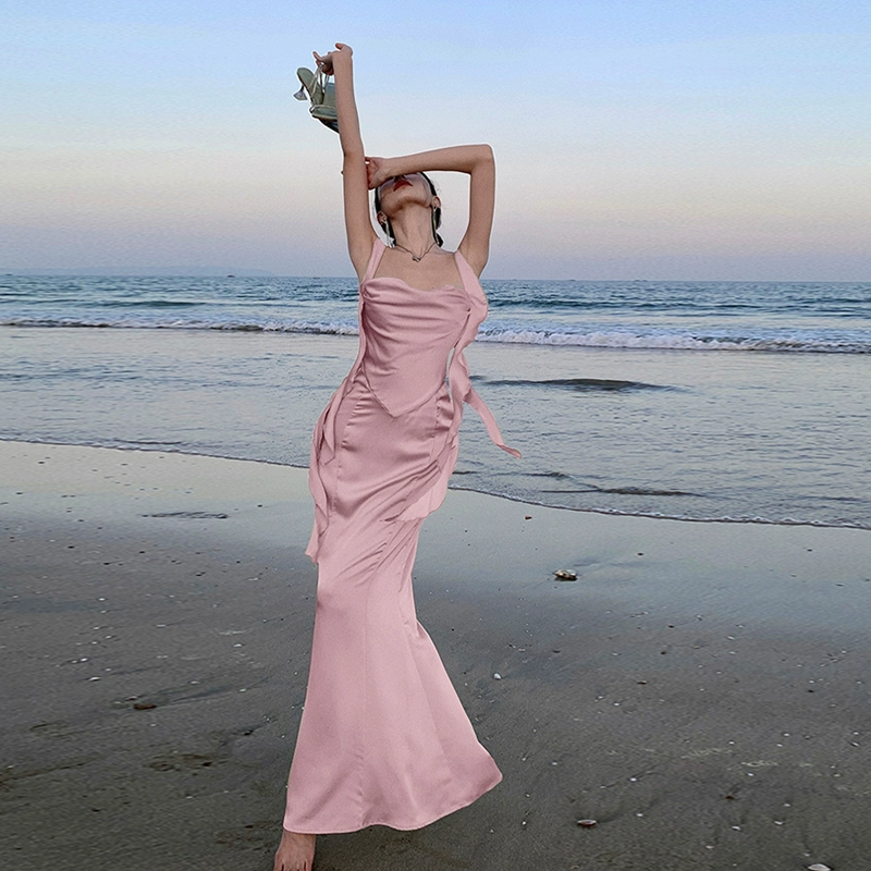 | nameOriginal | Green fishtail dress, high-end texture, banquet, feminine, socialite, sexy French swing collar suspender dress, summer |