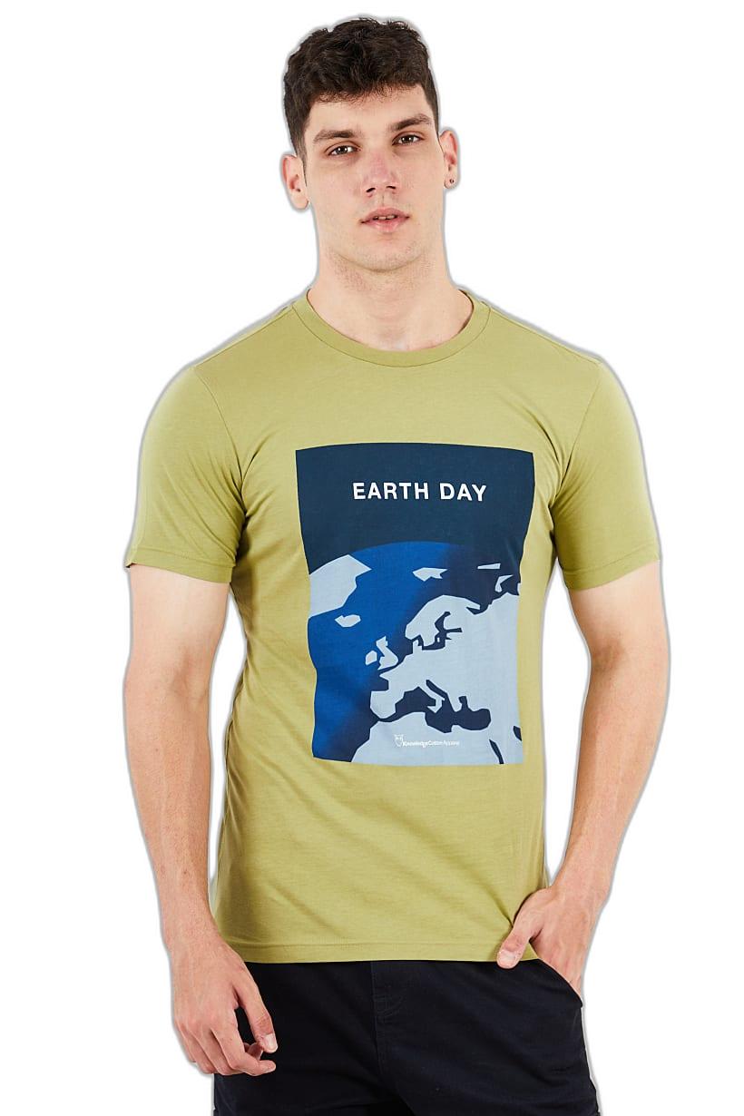 This product is made of 100% organic cotton and is machine washable. It has a regular fit and short sleeves with a crew neckline and straight hem. The t-shirt features a graphic print and is a pullover style with a green color family. Please note that the product color may vary slightly due to photographic lighting sources or monitor settings. It is suitable for casual occasions.