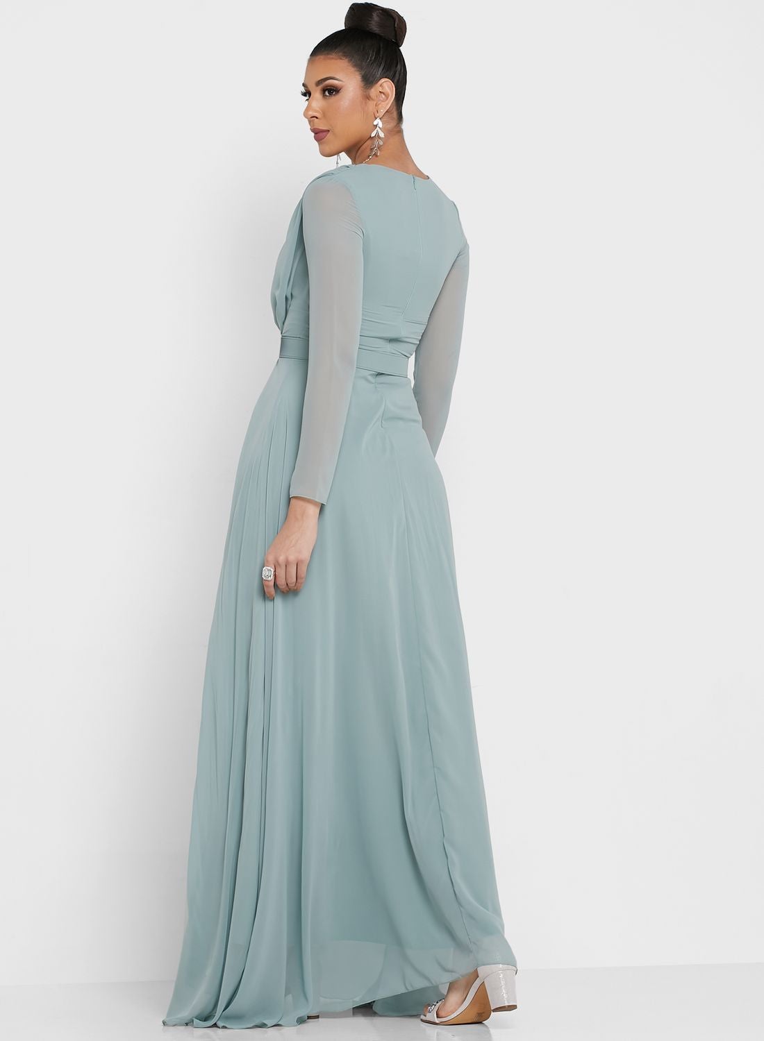 Ruched Detail Belted Round Neck Maxi Dress Green