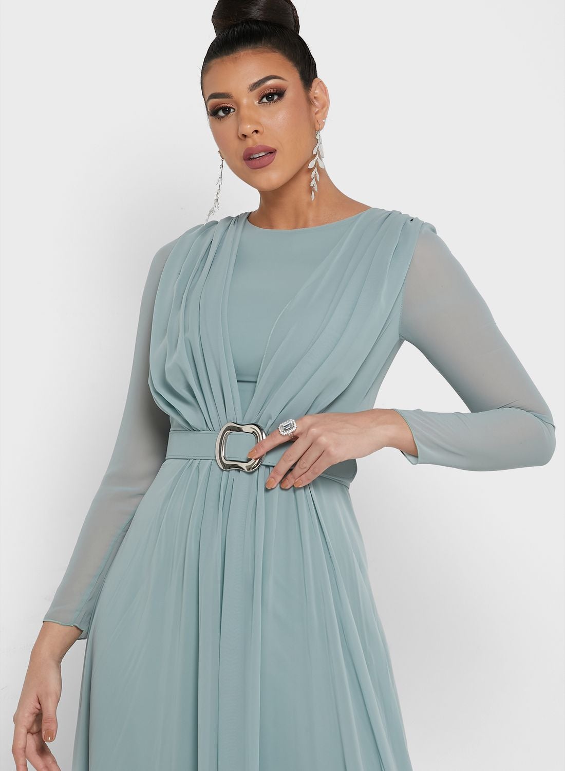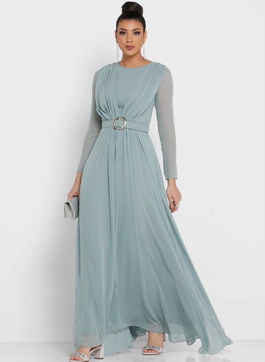 Green Maxi Dress with Belt and Ruched Detail on Round Neck.