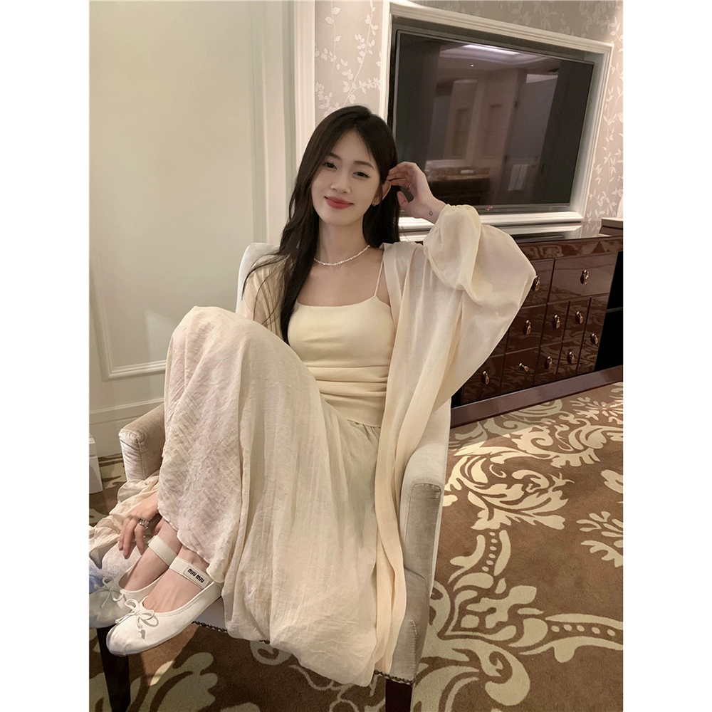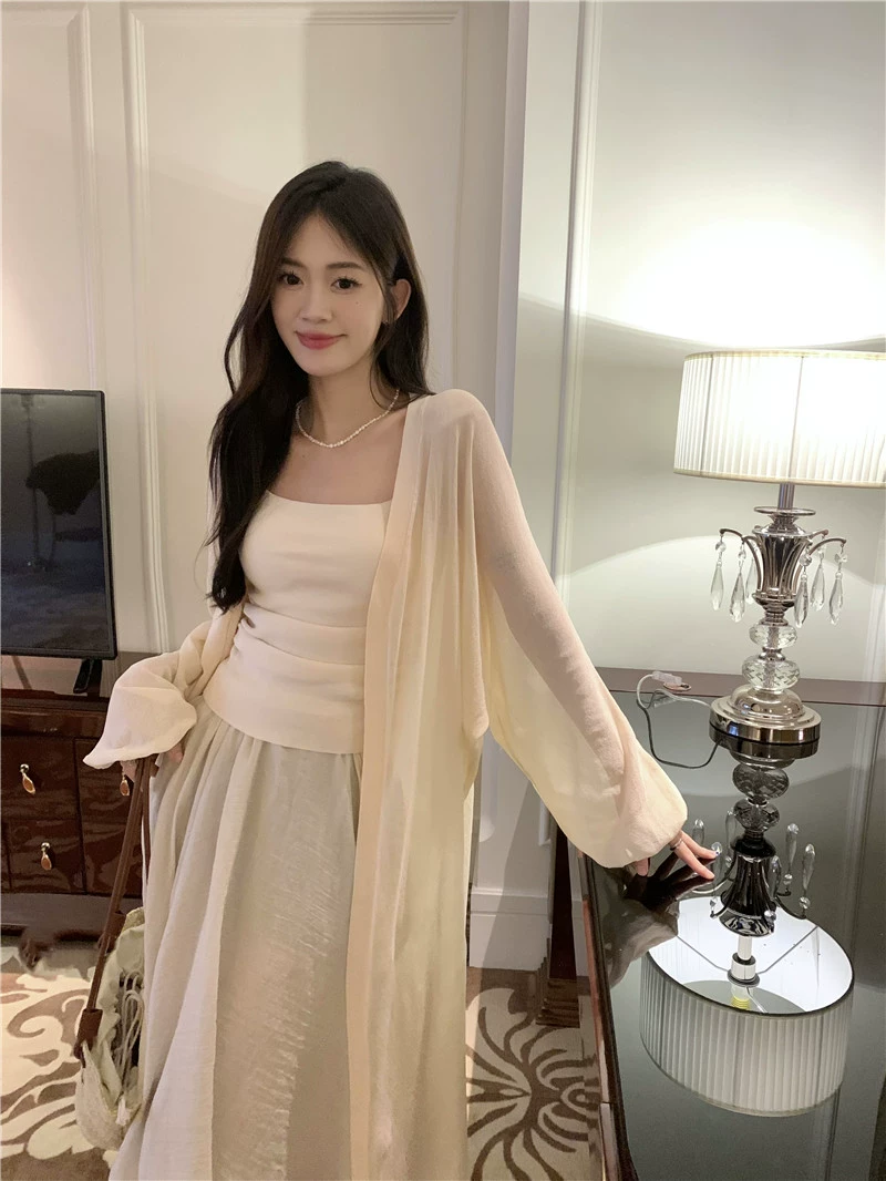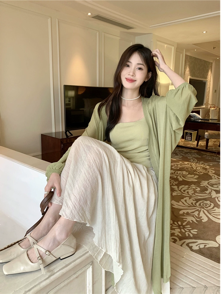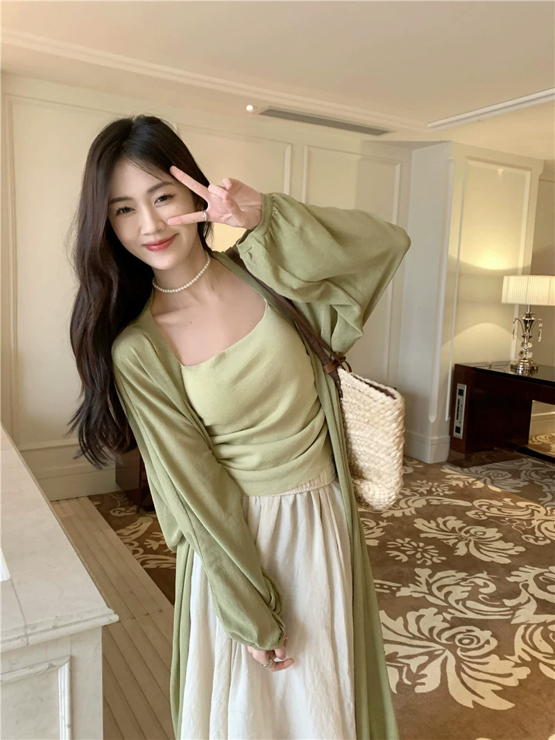| nameOriginal | Green mid-length sun protection cardigan paired with a fashionable suit |