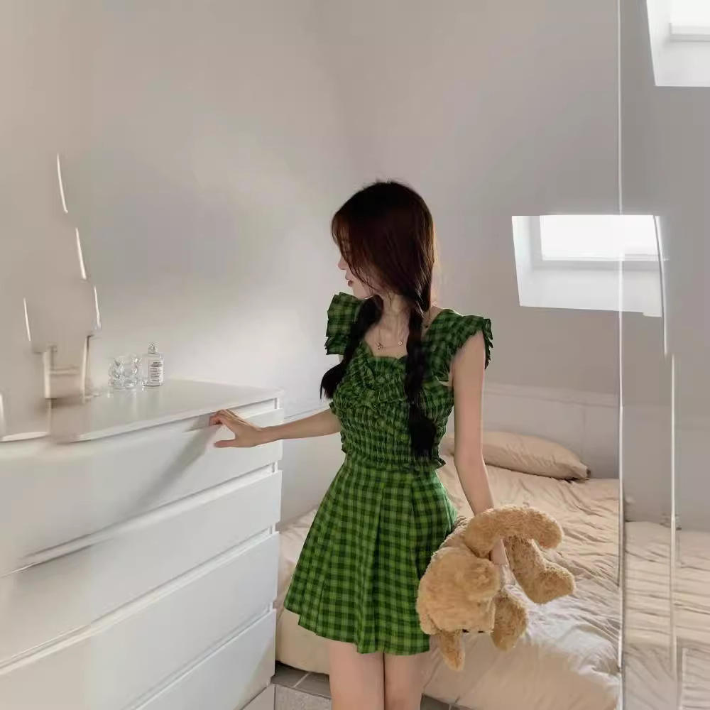 | nameOriginal | Green Plaid Sweet and Spicy suit Women's 2024 New Summer Petite Design Feeling Flying Sleeve Top Short Skirt Wear |