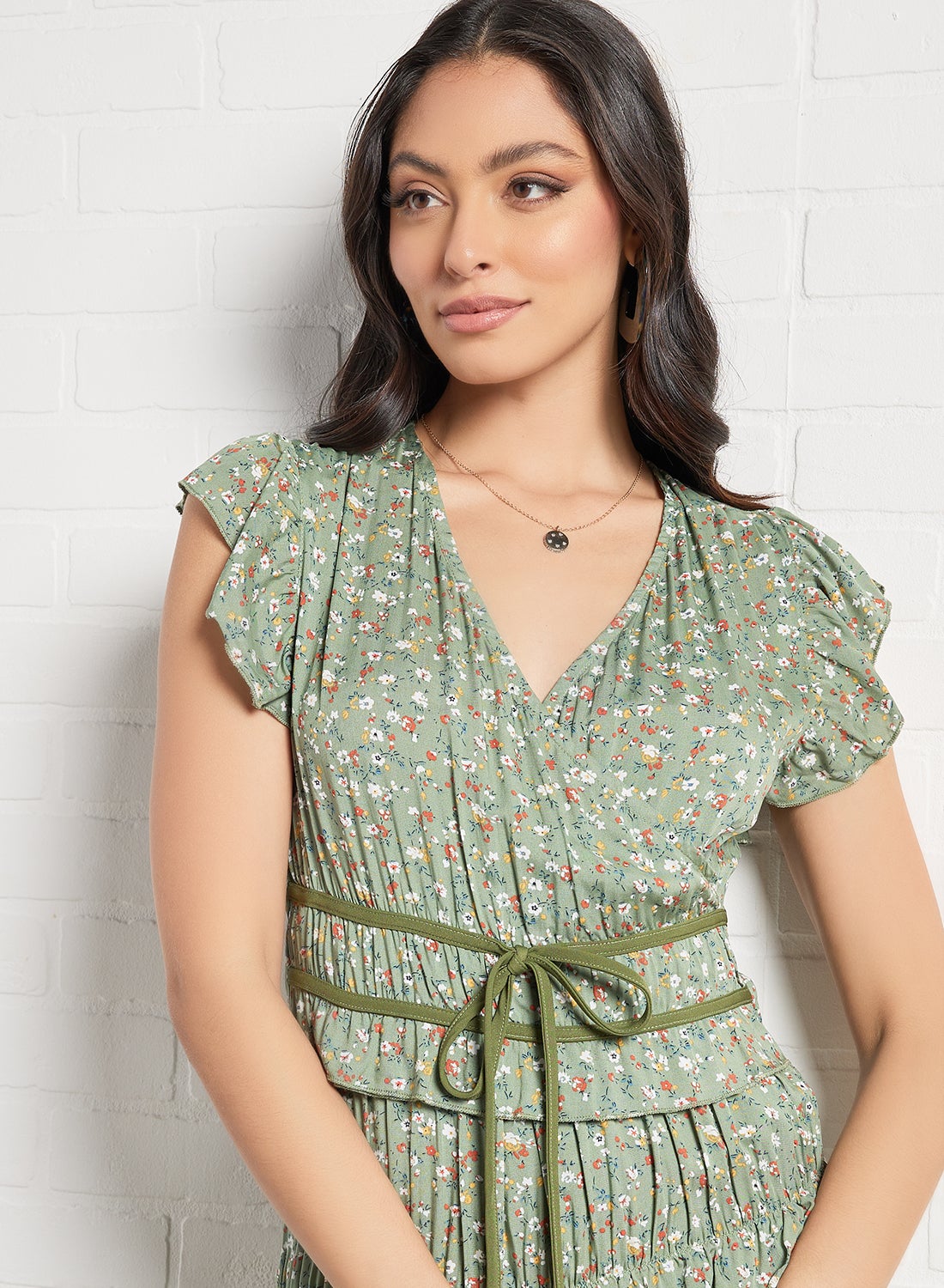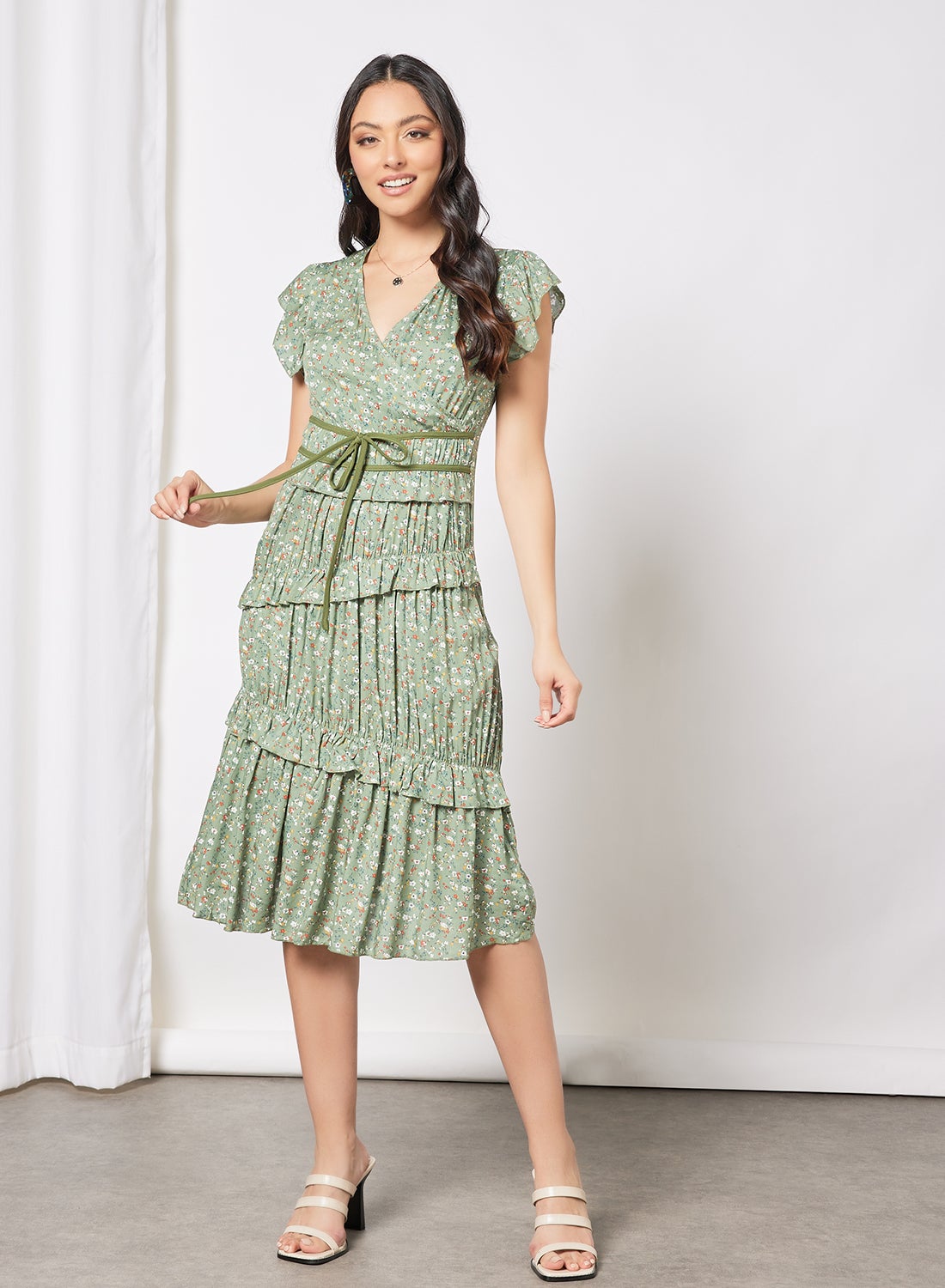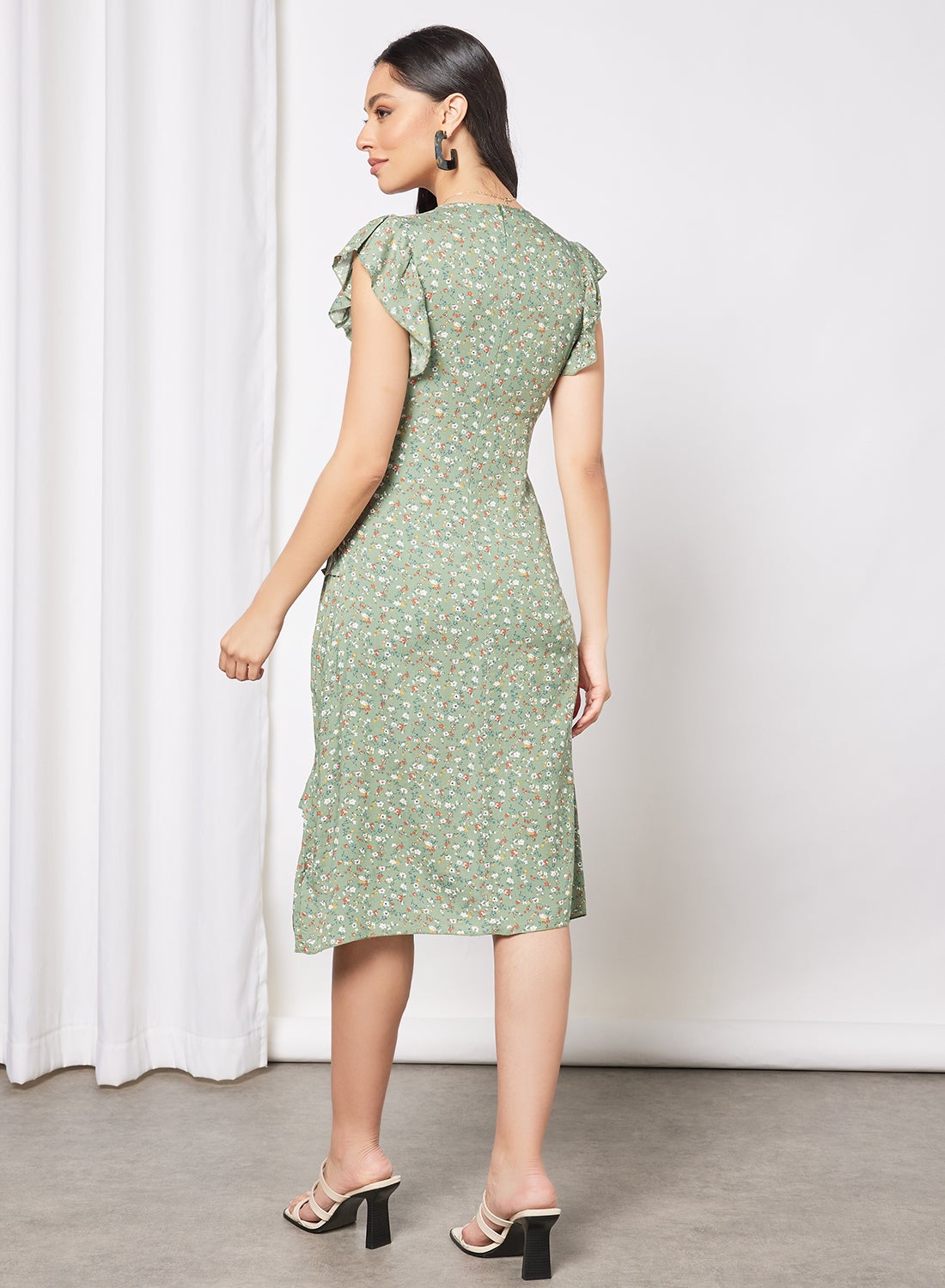 | nameOriginal | Casual Cross V-Neck Ruffle Cap Sleeve Bow Tie Knee Length Dress Printed Pattern 4 Green Print |