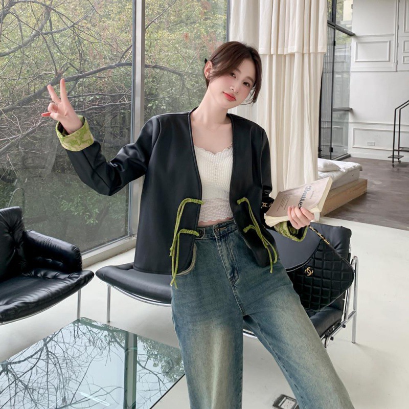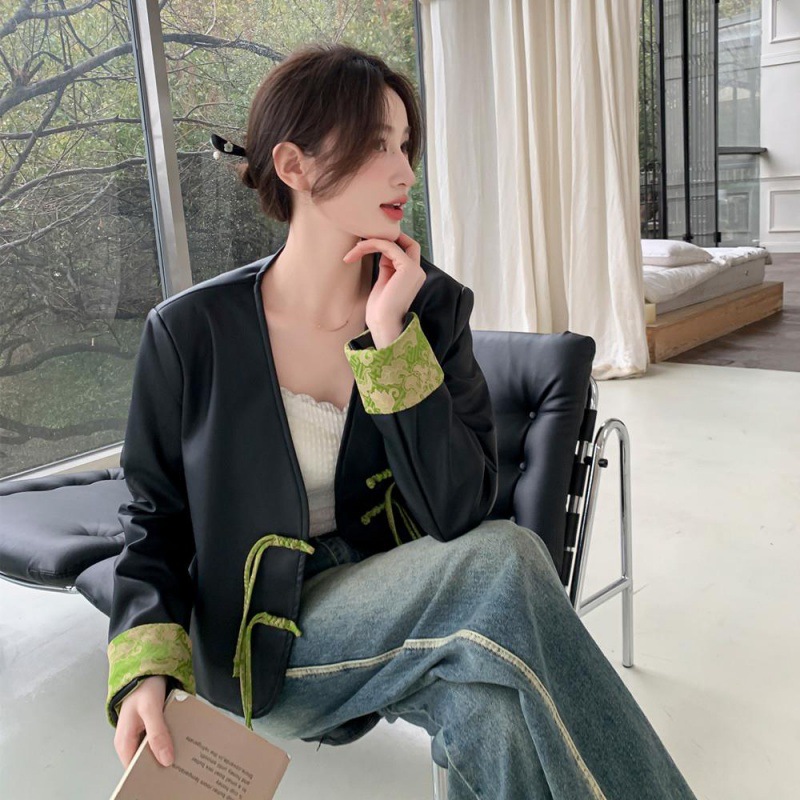 | nameOriginal | Green Stitching New Chinese Style National Style Leather Jacket Women's Spring and Autumn 2024 New Short Western Style Fashionable pu Leather Jacket |