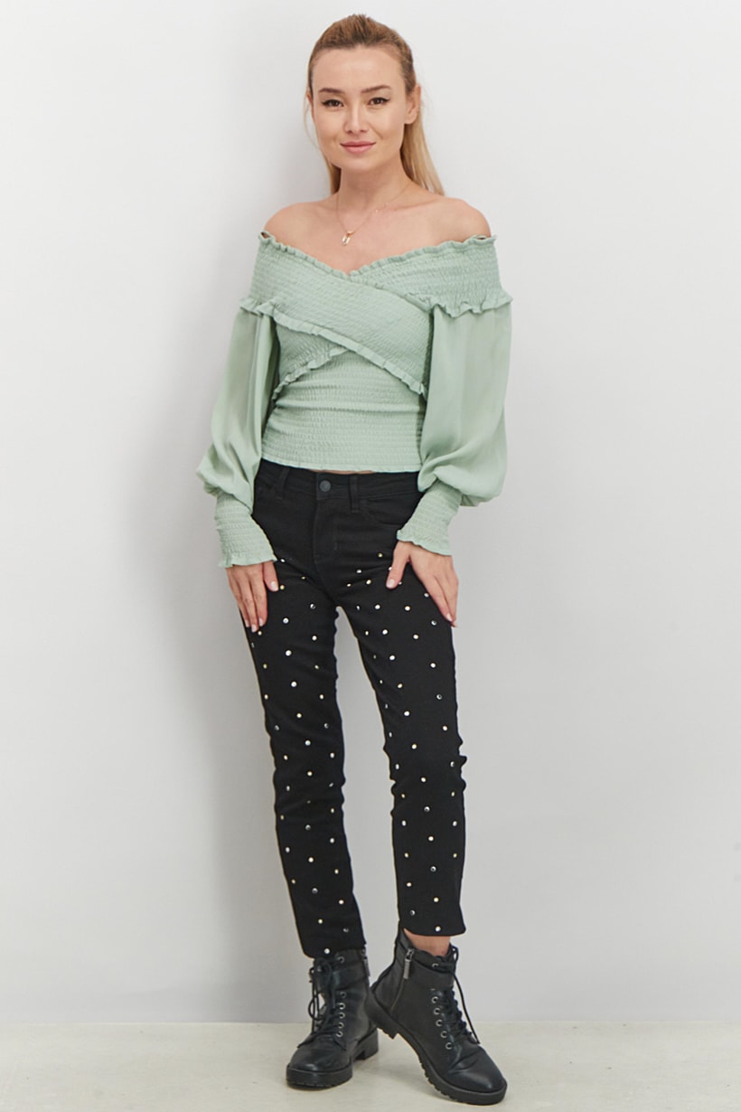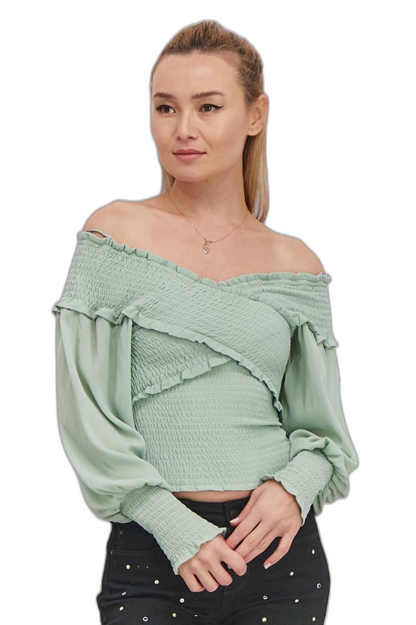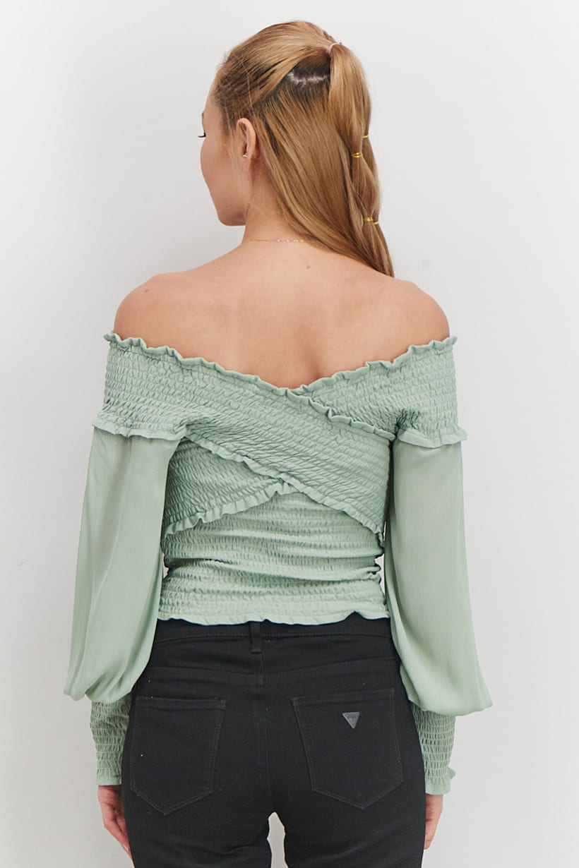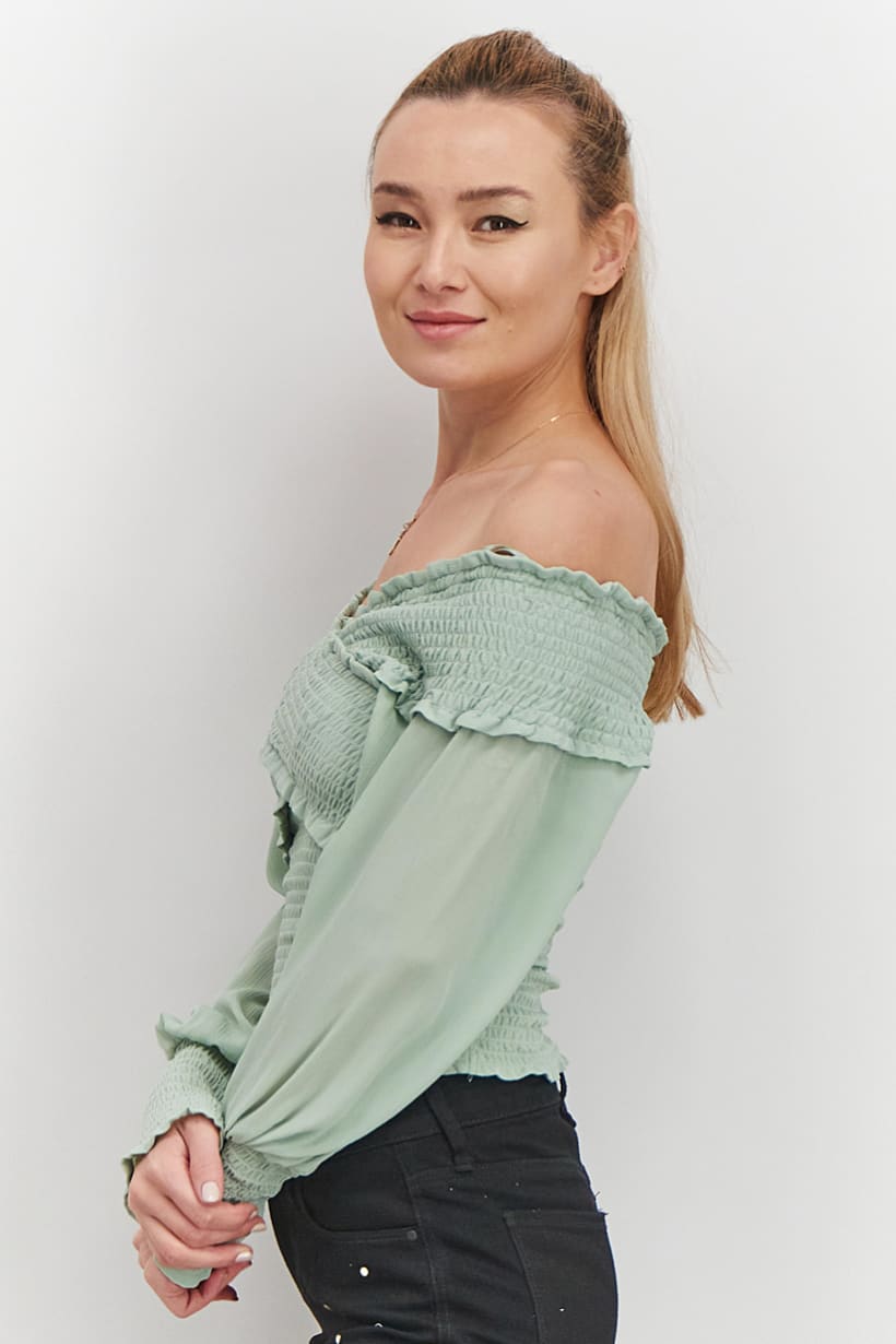 | sub_Categories | Women Clothing, Tops & Tees, women off shoulder neck long sleeve textured blouse green |