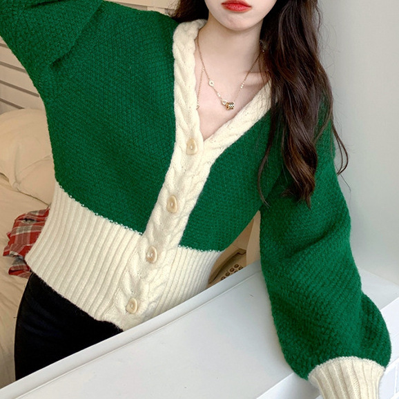 | nameOriginal | Green V-neck sweater coat women's autumn and winter 2024 new vintage gentle design sense niche knitted cardigan |