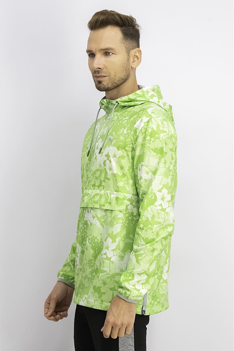 This sportswear jacket is made of 100% polyester and features a light thickness with a floral allover print in green. It has a hood with drawstrings and long sleeves, making it perfect for training. The machine washable jacket has a sportswear fit and is available in US sizes. Please note that the product color may vary slightly due to photographic lighting sources or monitor settings.