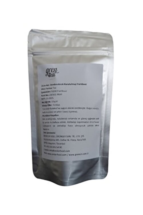 Freeze Dried (Freeze Dried) Frambuase Powder, 50g & Ingredients: 100% Frambuase (No additives such as colorants, preservatives, thickeners or sweeteners) & Product form: Powder & Net weight: 50 g & Drying technology: Freeze drying (Freeze drying) & Farming method: Traditional agriculture & Packaging: Aluminum doypack with air and moisture barrier Country of Origin: Turkey & Use Information: Produced in accordance with Turkish Food Codex. Freeze-dried fruit products are used as food ingredient in bakery products (cakes, cakes and cookies), chocolates and confectionery, dairy products (yogurt, kefir, milk, ice cream and sweets), beverages (smoothie and milkshake), baby supplement foods, sauces and salads & Storage Conditions: Freeze-dried products have very low moisture content and they can quickly attract moisture in the air. If the entire product will not be used after the packaging is opened, the air inside the package should be removed first by squeezing, and then tightly closed using the packaging lock so that it does not get air. Store at room temperature, dry and away from sunlight. & What is Freeze Drying? Freeze drying is one of the widely used fruit drying methods in the food industry. In this method, before the water in the fruit is about -40? C is frozen and the freezing water is removed as steam without re-liquefaction at low temperature. As freeze-drying takes place at low temperature, dried fruits show properties that are very close to their fresh state in color, taste, shape and nutritional value. Due to the high quality of products obtained, it is considered the best drying method.