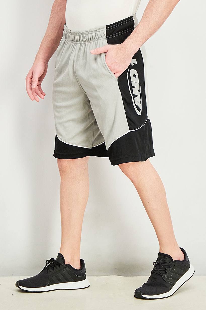 | nameOriginal | Men Sportswear Fit Brand Logo Basketball Shorts, Grey and Black |