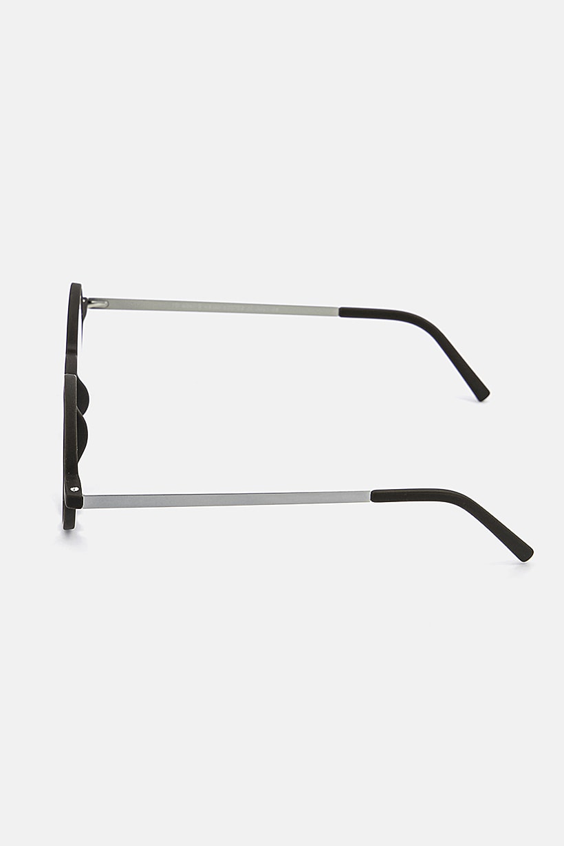 This product features a round-shaped frame in a sleek grey color, with a full rim style made from a combination of plastic and stainless steel materials. The clear plastic lenses provide a clean and modern look.