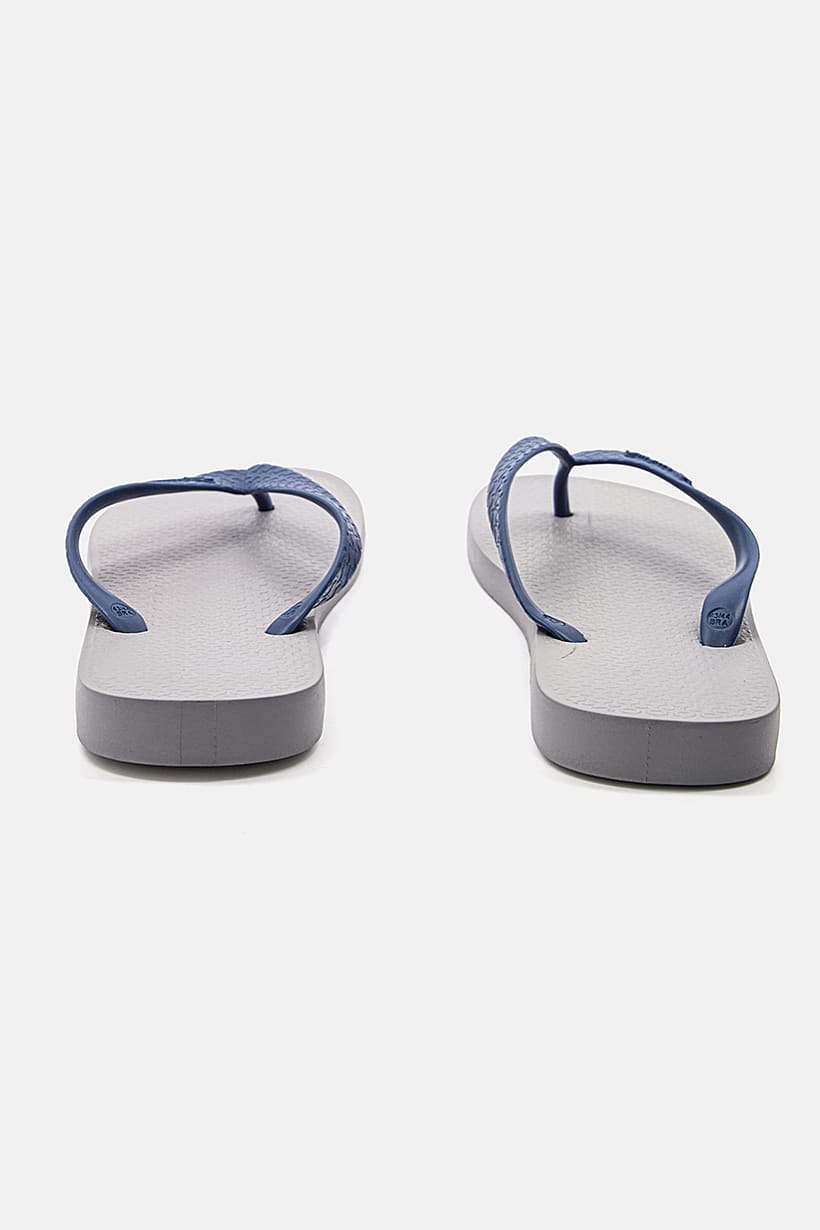 Grey and Teal Slip-On Flip Flops with Brand Logo for Men.