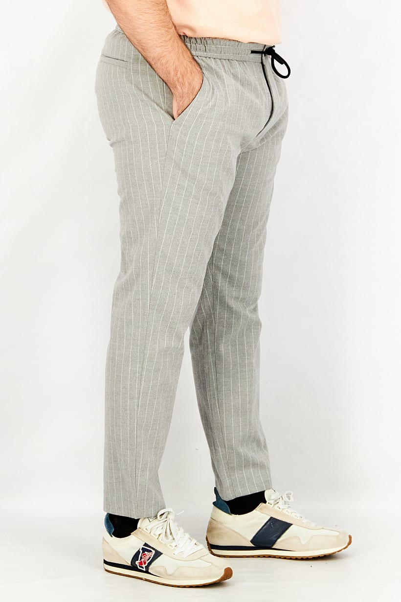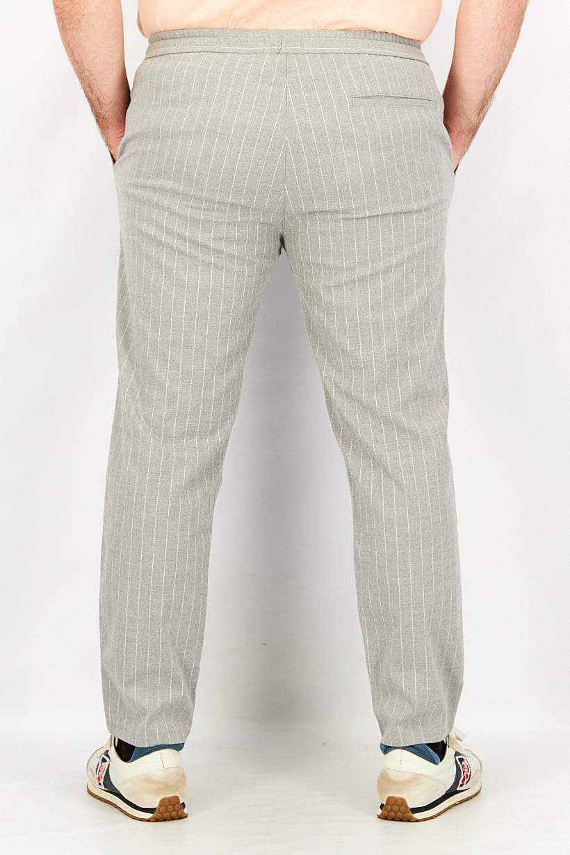 Grey and white striped chino pants with a skinny fit for men, made with stretchable fabric.