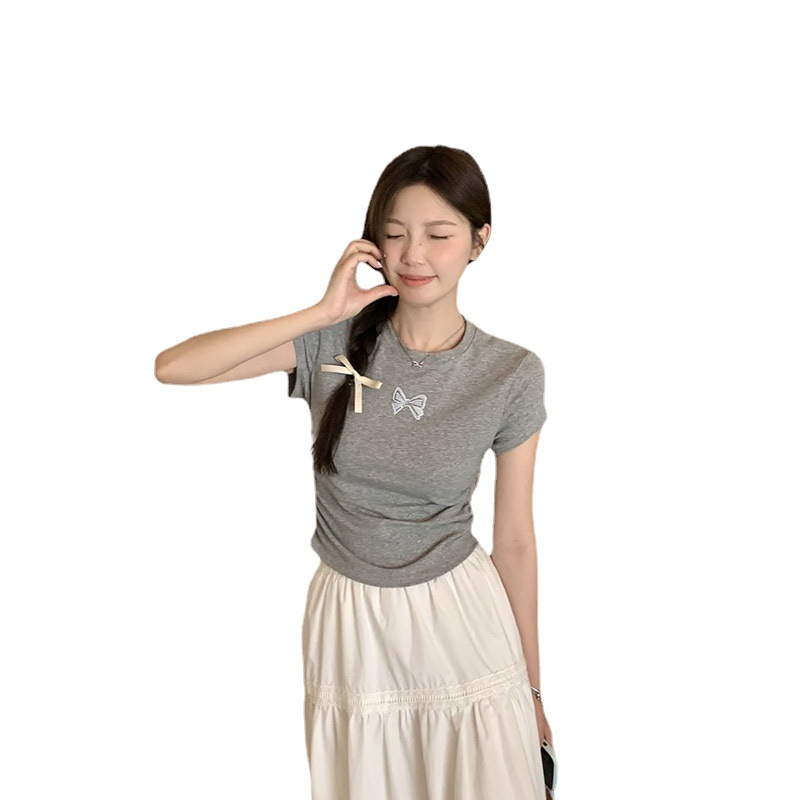 Grey Bow Thread Shoulder Short-sleeved T-shirt Women’s Summer Bm Irregular Waist Slim-fit Slim-fit Short Top