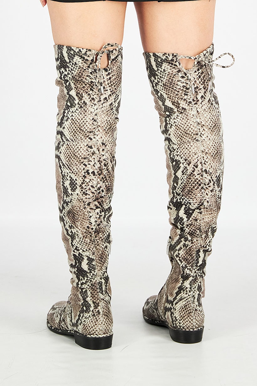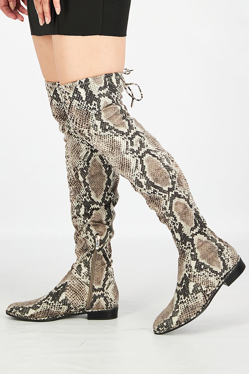 Heel Height : 1" / 2.5 cm, Heel Style : Block heel, Ideal For : Women, Shoe Closure : Tie closure, Shoe Width : Medium, Sole Material : Synthetic sole, Style : Over-the-knee boot, Toe Style : Closed toe, Disclaimer : Product color may slightly vary due to photographic lighting sources or your monitor settings., Occasion : Casual, Pattern & Print : Snakeskin, Shoe Material : Fabric, Color Family : Grey,