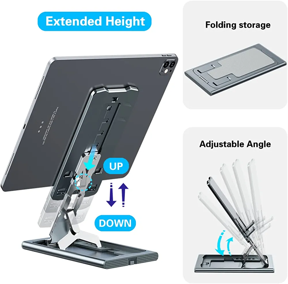 2️⃣ Universal Phone Tablet Stand with Compact Body — This desktop phone stand is a sturdy base support, make the small folding pocket mobile phone stand universal as iPad pro air mini 2 4 5, 8th 7th 6th 4th generation, 12 inch tablet stand holder cradle