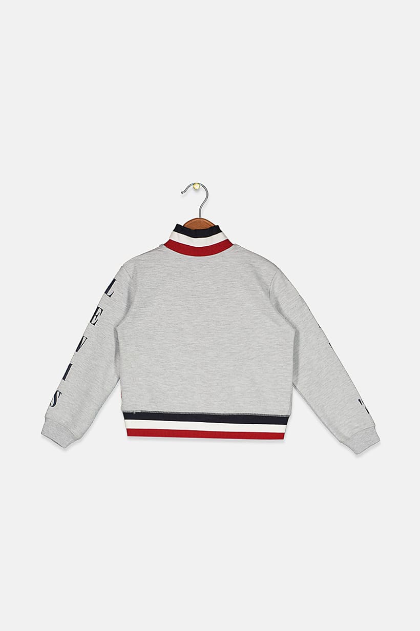 | descriptionOriginal | Care : Machine washable, Ideal For : Boys, Sleeve Length : Long Sleeve, Type of Hem : Elasticized hem , Type of Neckline & Collar : Split neck, Disclaimer : Product color may slightly vary due to photographic lighting sources or your monitor settings., Fabrics : 100% Cotton, Occasion : Casual, Pattern & Print : Brand Logo, Type of Sleeve : Long sleeve , Types of Closures : Zipper closure, Color Family : Grey, |
