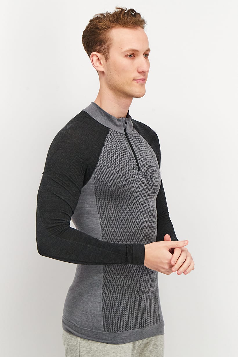 This product is easy to care for as it is machine washable. It has a sportswear fit and is available in international sizes. The long sleeves and light thickness make it suitable for training. The neckline is a mock style and the fabric is a blend of 55% wool, 43% polyamide, and 2% elastane with a textured pattern. The t-shirt has a zipper closure and comes in a grey color family. Please note that the product color may vary slightly due to lighting or monitor settings.