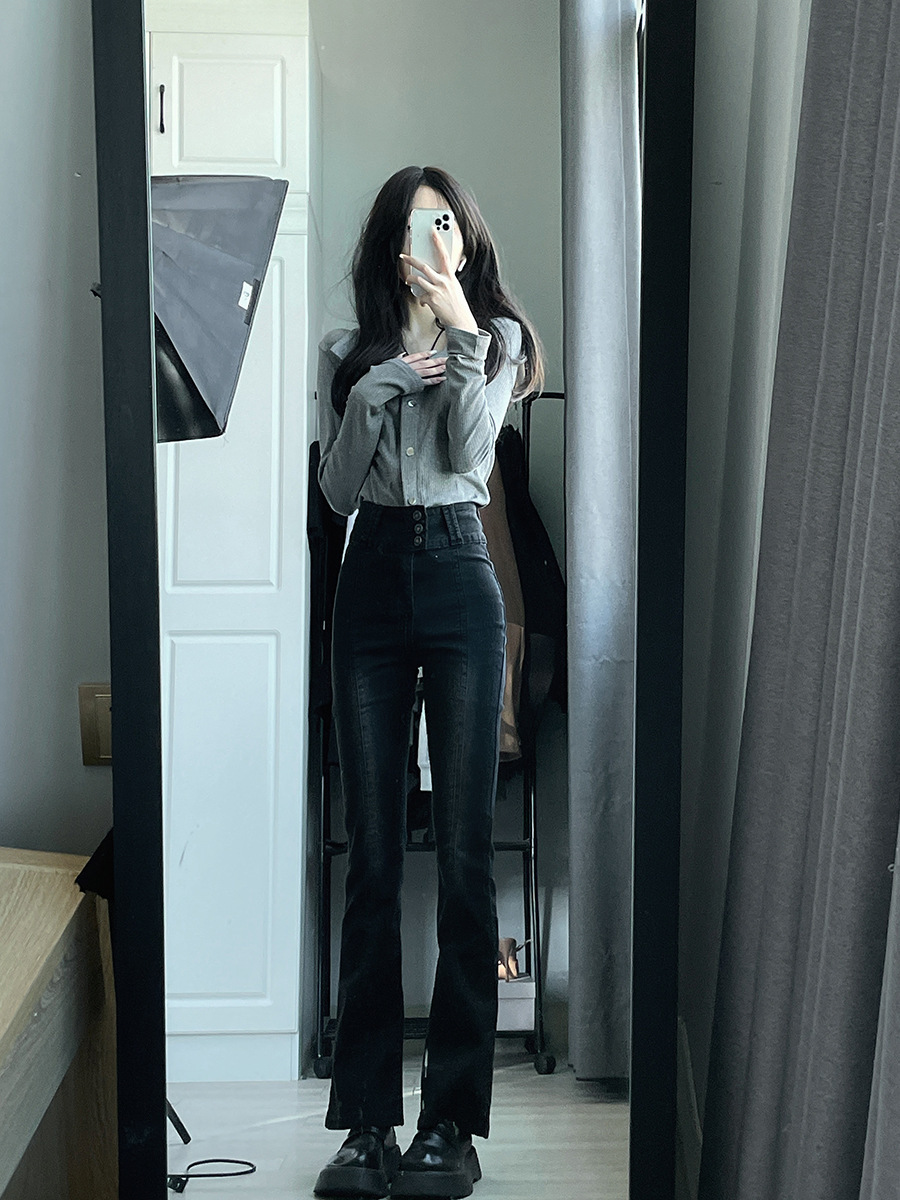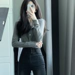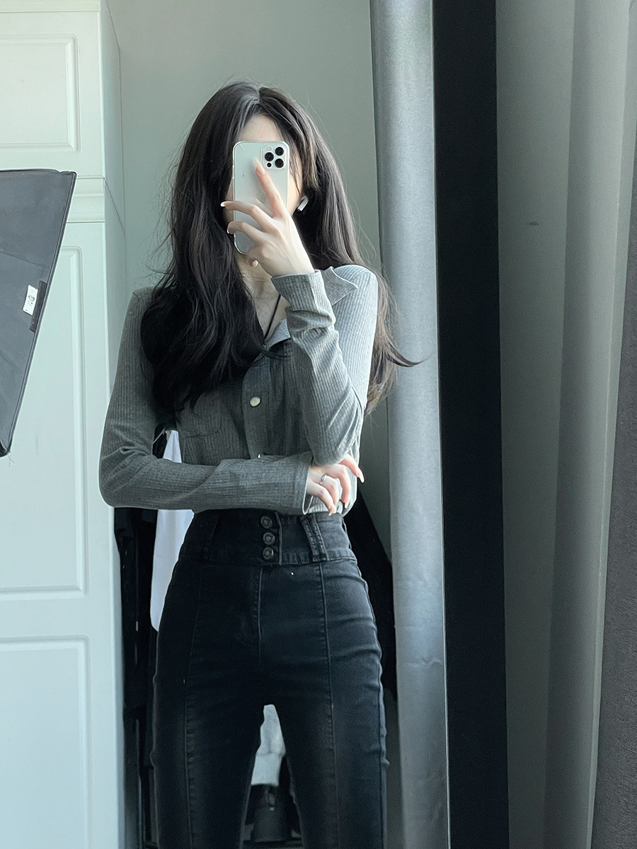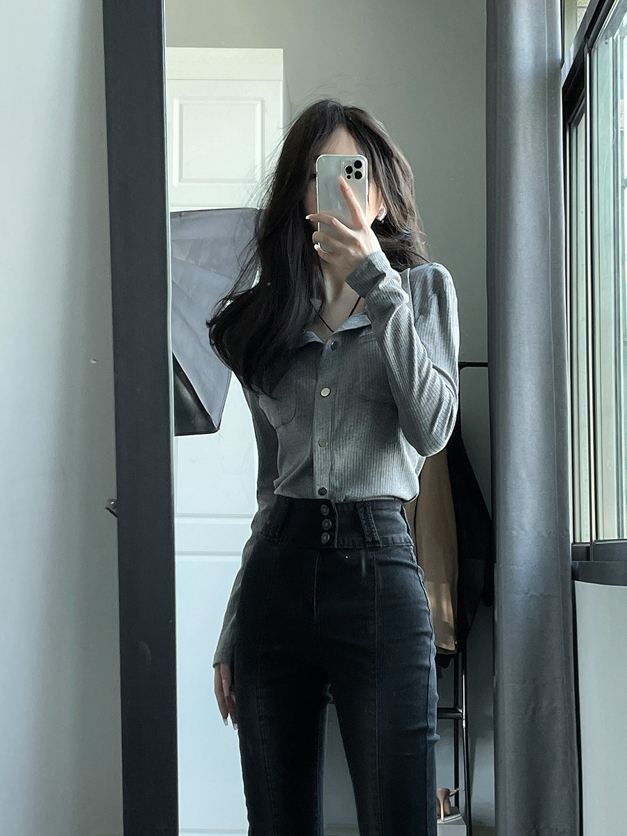 | nameOriginal | Grey Hong Kong Style Vintage Polo Collar Long Sleeve Shirt Women's Spring Inner Cardigan Design Sense Niche Top Trend |