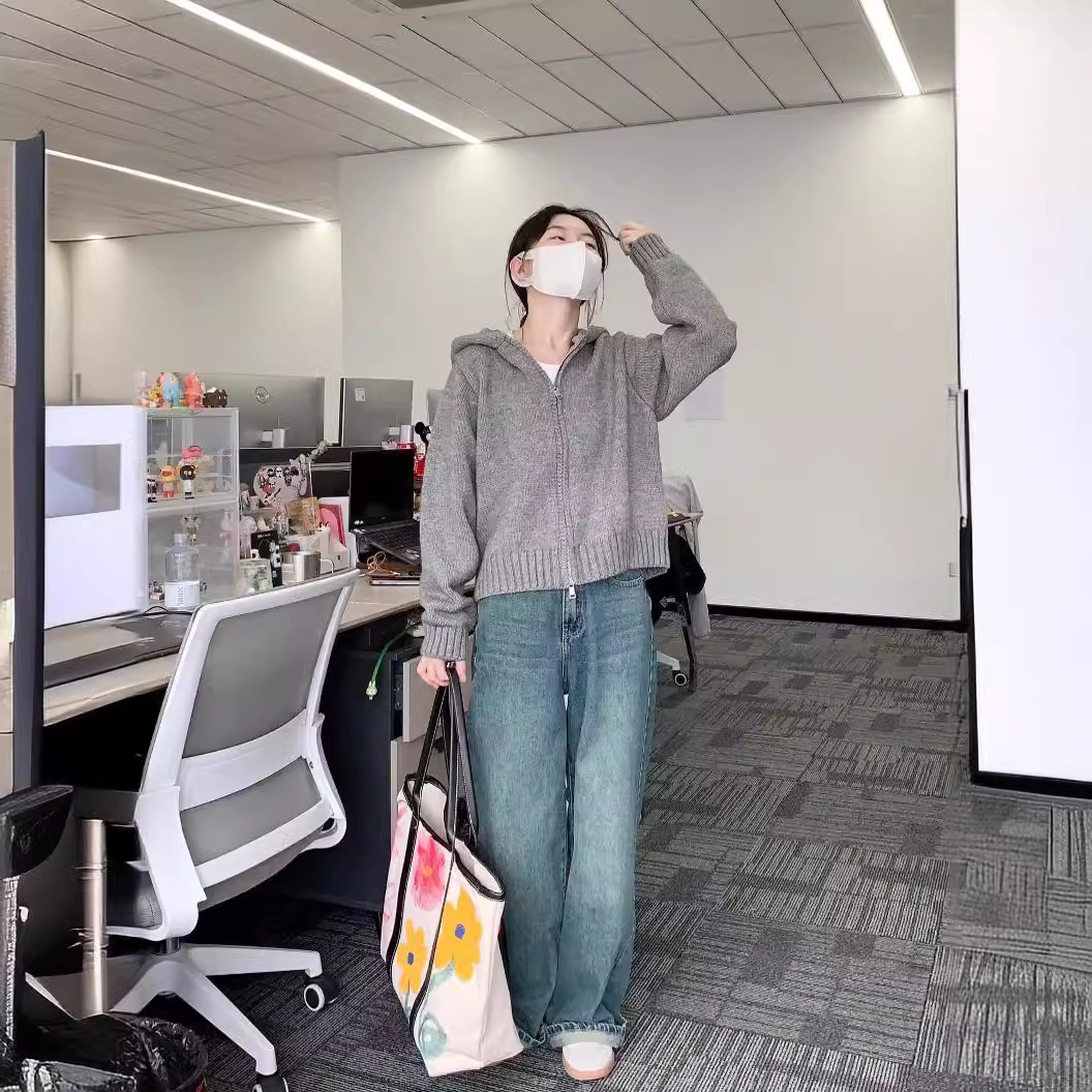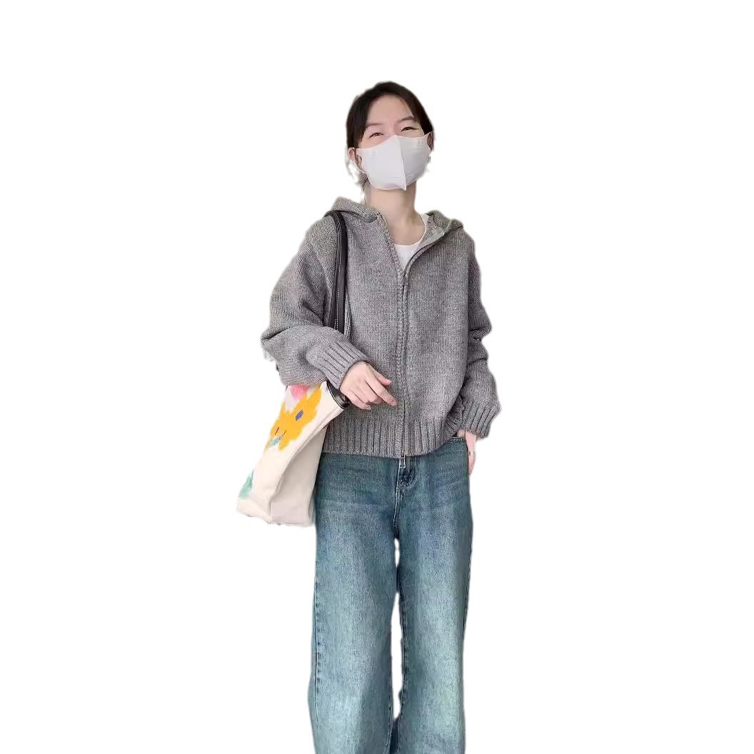 Grey Hooded Double Zipper Sweater Jacket Women’s Autumn and Winter Hoodie Thickened Outer Short Knitted Cardigan Spandex