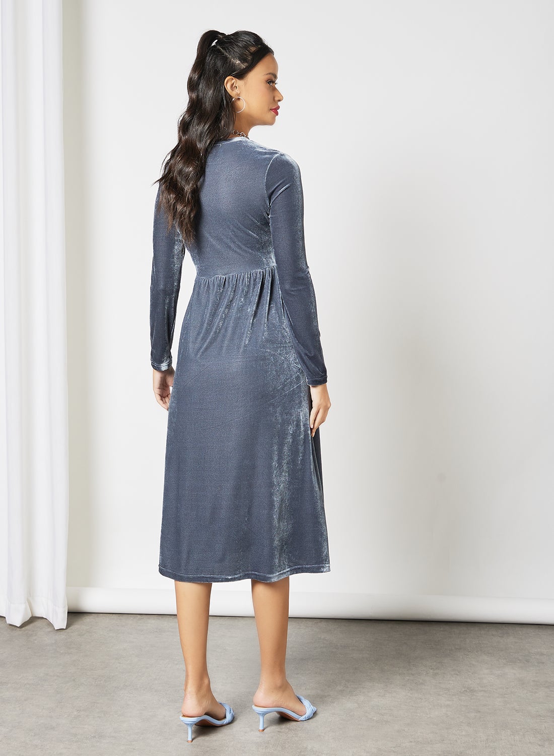 Grey Knit Maxi Dress with Mandarin Collar and Long Sleeves.